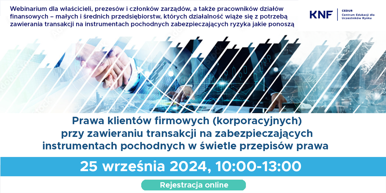 Urząd Komisji Nadzoru Finansowego zaprasza małych i średnich przedsiębiorców na webinarium CEDUR „Prawa klientów firmowych (korporacyjnych) przy zawieraniu transakcji na zabezpieczających instrumentach pochodnych w świetle przepisów prawa”, które odbędzie się 25 września 2024 roku (10:00-13:00).
