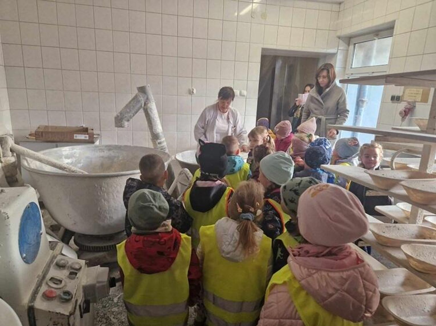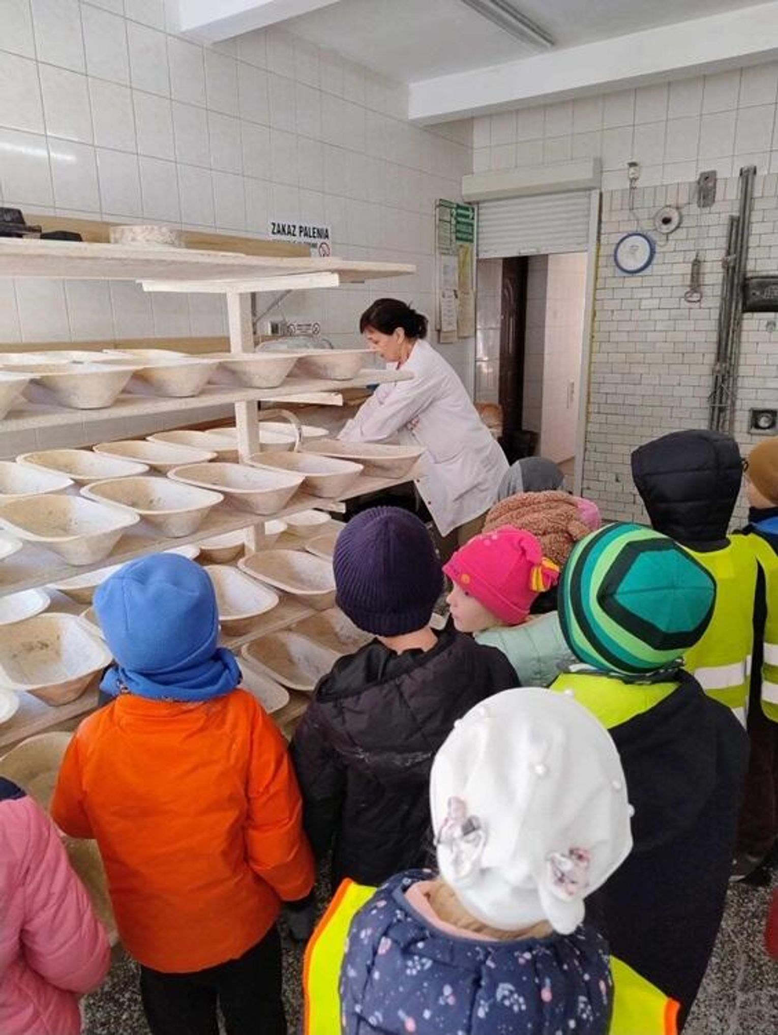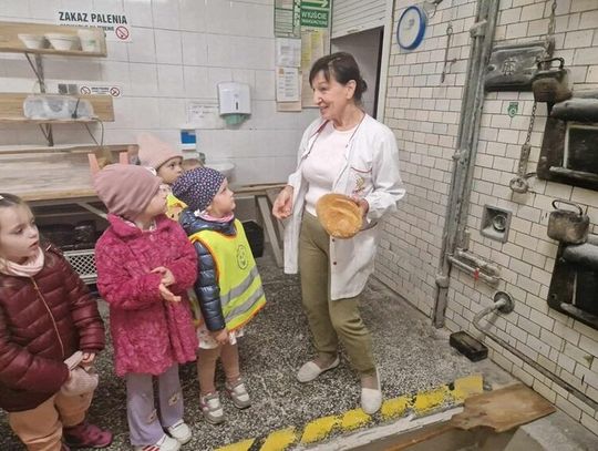 Przedszkolaki miały okazję zobaczyć, jak wygląda piekarnia od środka. Z wielkim zainteresowaniem przyglądały się pracy piekarza, poznały etapy powstawania pieczywa oraz produkty potrzebne do jego wypieku. Zobaczyły maszyny używane w procesie wypieku - najbardziej podobały się oczywiście głębokie piece oraz wielkie misy do mieszania ciasta. Na koniec dzieci zostały poczęstowane ciepłymi rogalikami i drożdżówką.
