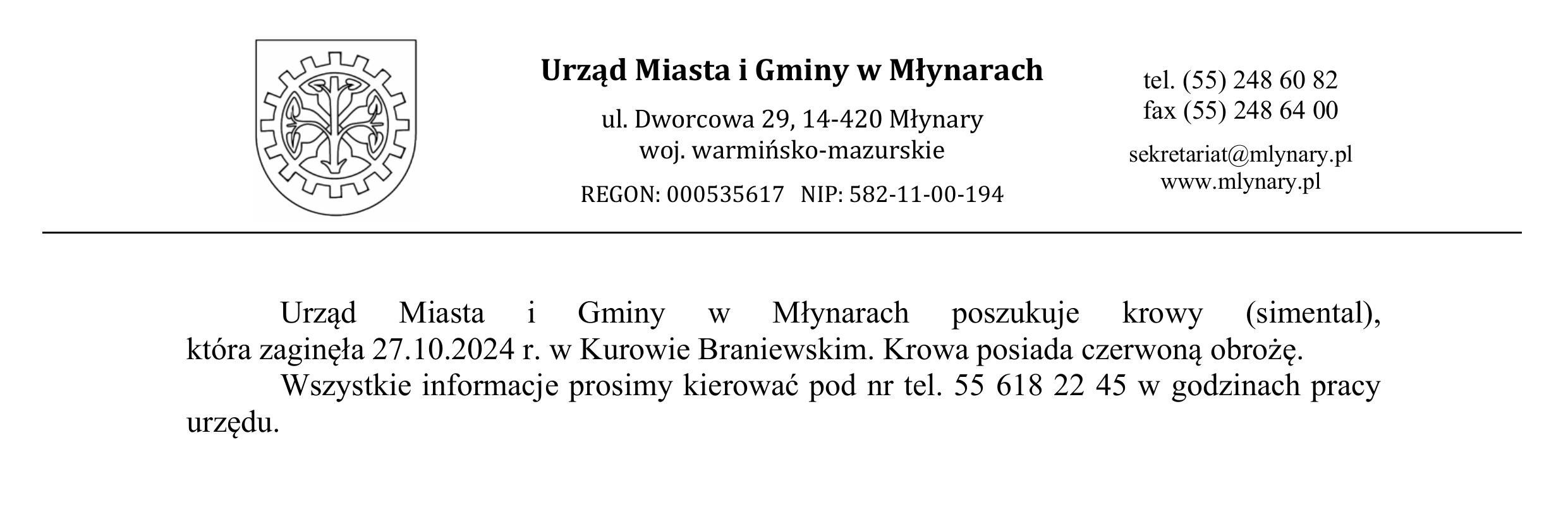 Urząd Miasta i Gminy w Młynarach poszukuje krowy.