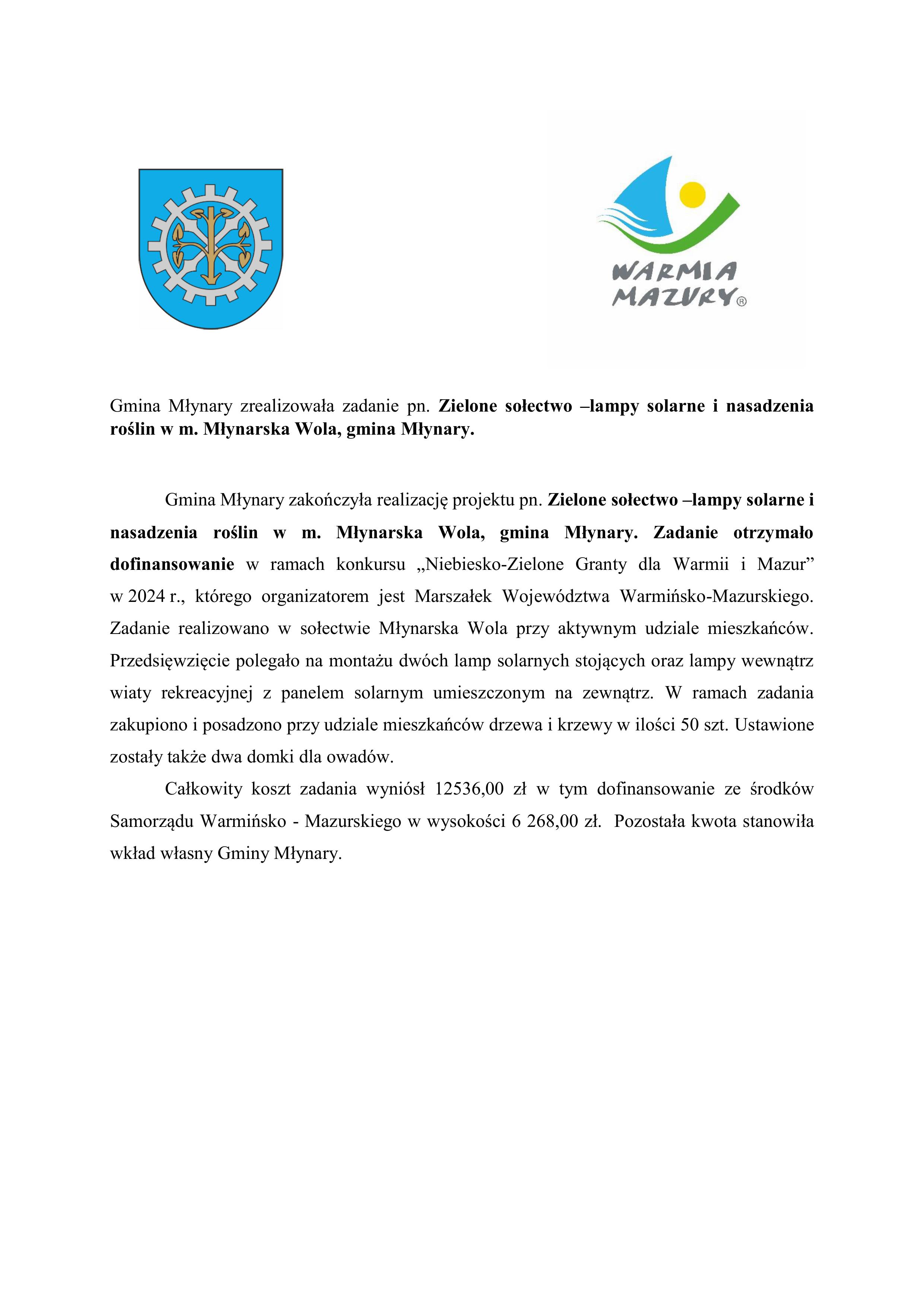 Gmina Młynary zrealizowała zadanie pn. Zielone sołectwo –lampy solarne i nasadzenia roślin w m. Młynarska Wola, gmina Młynary.