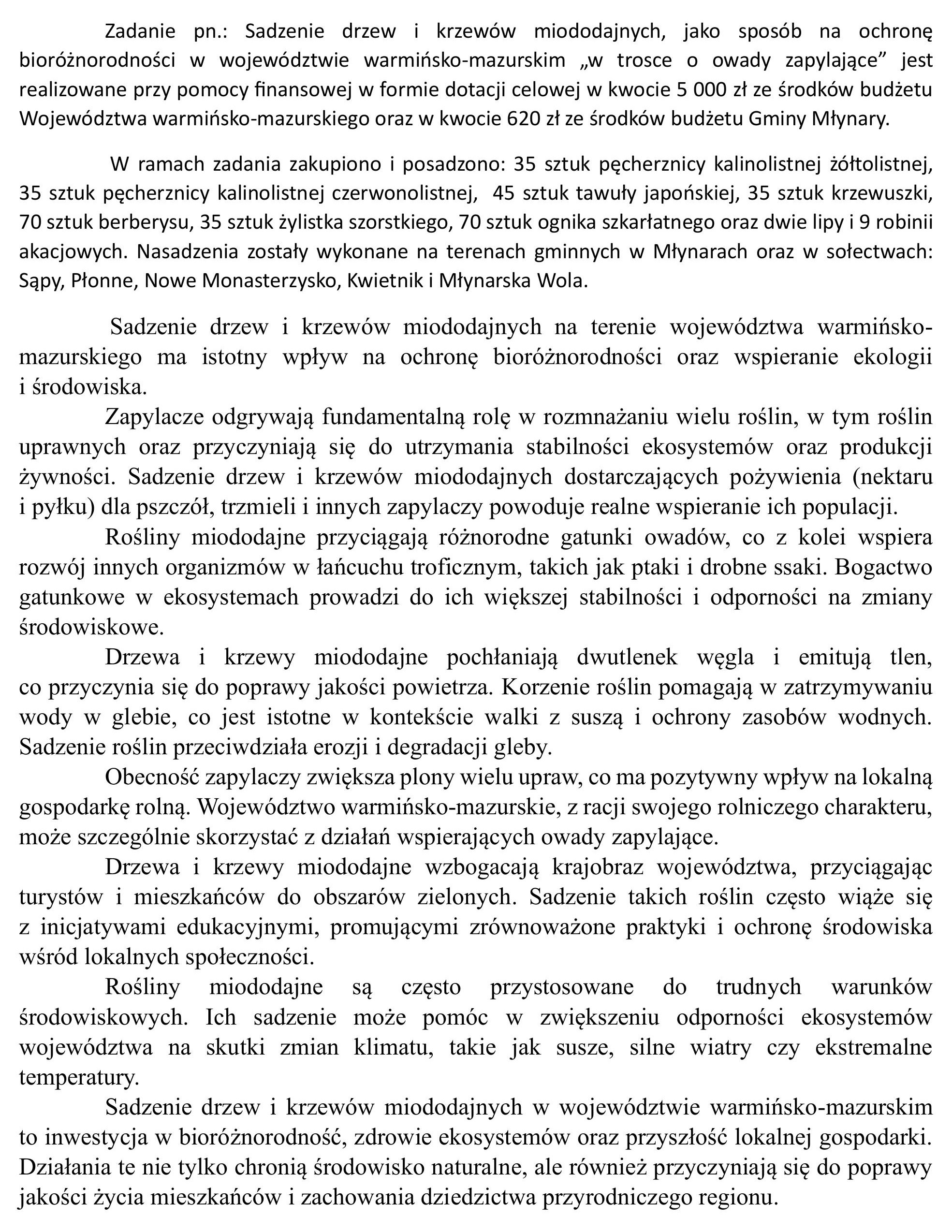 Gmina Młynary realizuje zadania pn. Sadzenie drzew i krzewów miododajnych, jako sposób na ochronę bioróżnorodności w województwie warmińsko-mazurskim „w trosce o owady zapylające”.