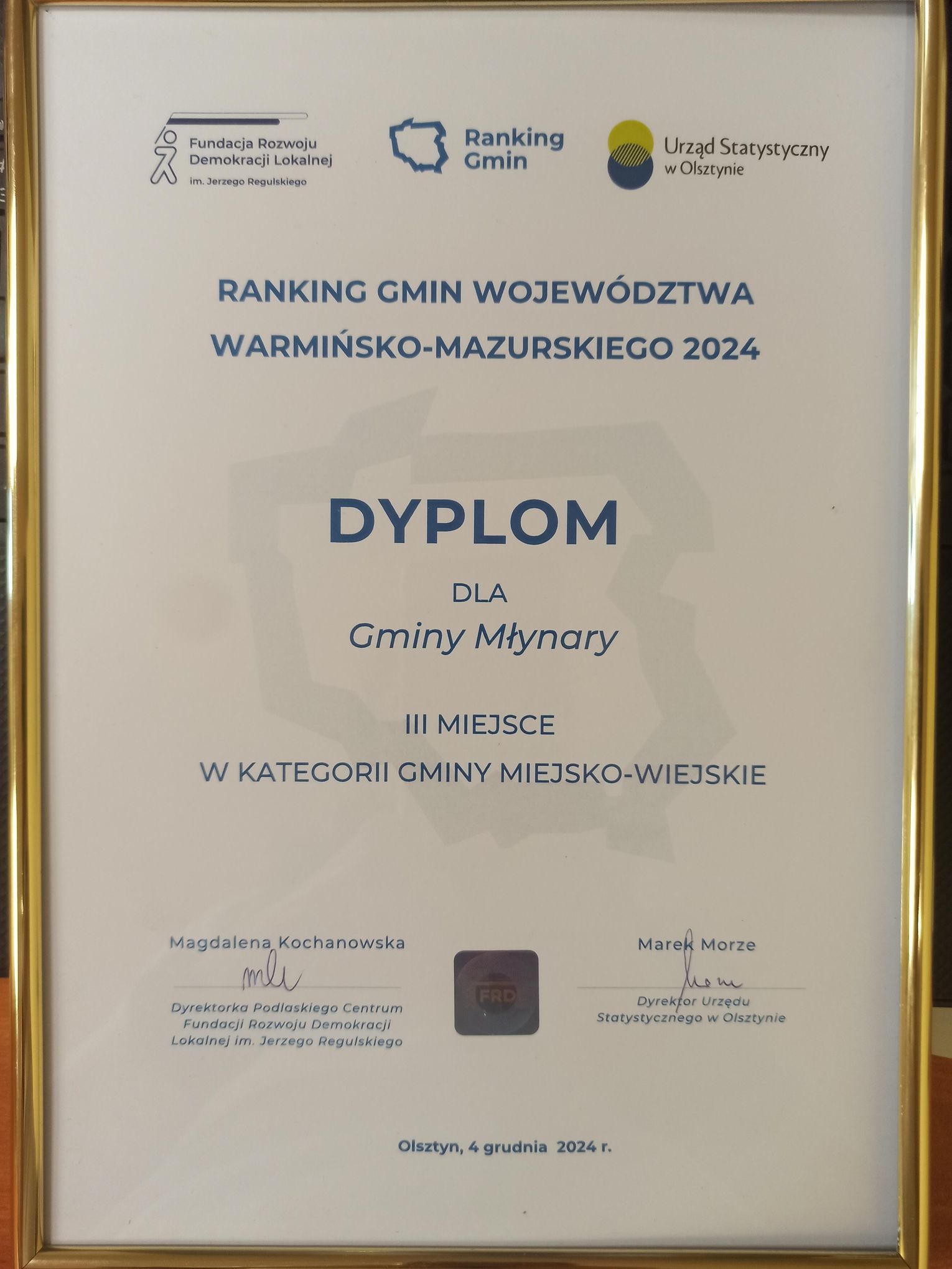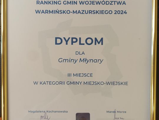 Gmina Młynary zajęła III miejsce (obok takich gmin jak Mikołajki i Olecko) w Rankingu Gmin Województwa Warmińsko-Mazurskiego w kategorii Gminy Miejsko-Wiejskie. To drugi rok z rzędu, gdy nasza gmina znajduje się na podium (w ubiegłym roku było to II miejsce), co świadczy o systematycznym rozwoju i skutecznych działaniach na rzecz mieszkańców.