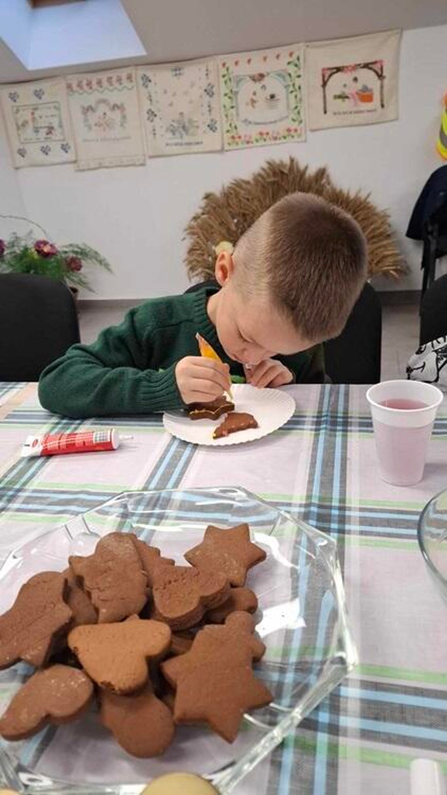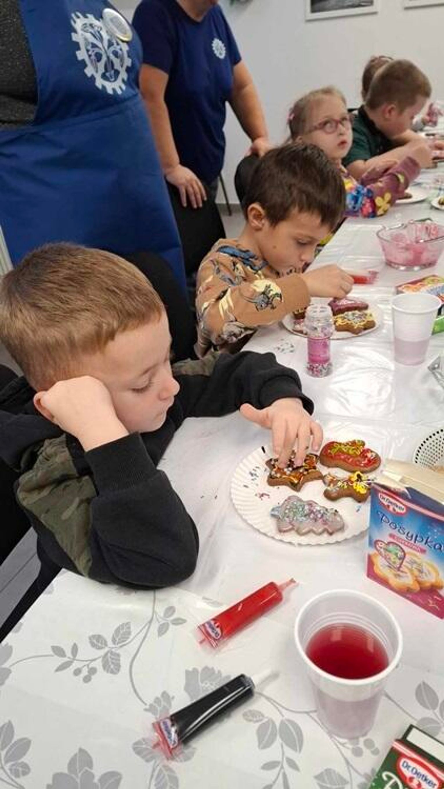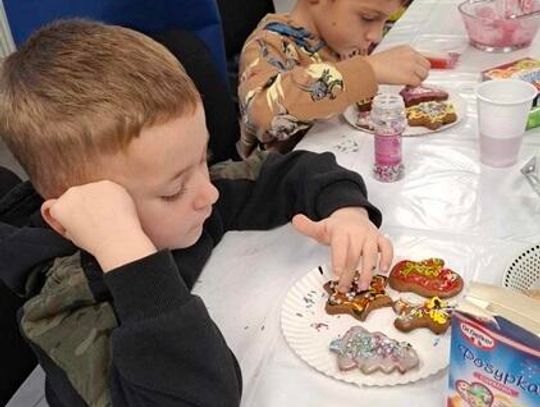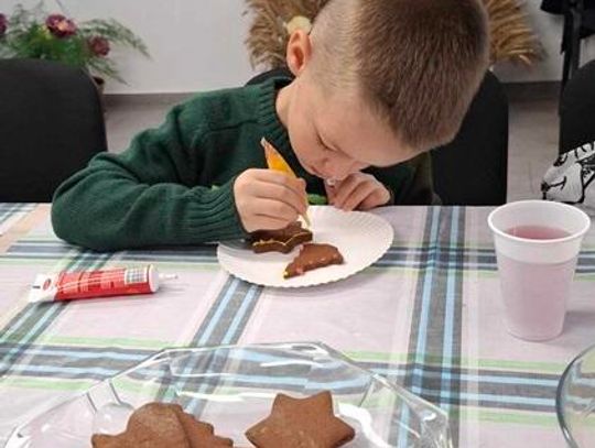 Najpierw dzieci poznały składniki i sposób wykonania ciasta, a następnie ochoczo zabrały się do pracy. Z przygotowanego przez Panie ciasta zostały upieczone pierniczki. Wspaniały zapach unosił się w całym budynku Koła Gospodyń i wprawił przedszkolaki w świąteczny nastrój. "Jeżyki" zajęły się dekorowaniem upieczonych pierników - z wielkim zaangażowaniem ozdabiały je lukrami oraz różnymi posypkami. Każdy piernik był jedyny w swoim rodzaju.