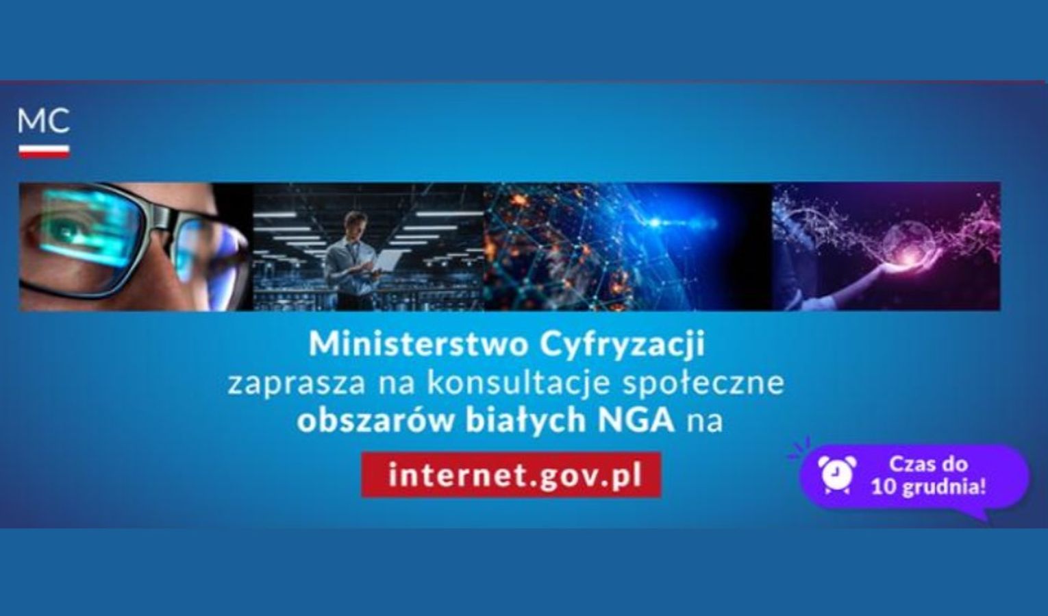 Ministerstwo Cyfryzacji rozpoczęło konsultacje społeczne obszarów białych NGA, w ramach których ustalą, gdzie nie powstanie komercyjna infrastruktura telekomunikacyjna NGA, umożliwiająca świadczenie usług dostępu do internetu o przepustowości co najmniej 100 Mb/s. Konsultacje prowadzone będą przez stronę internet.gov.pl i potrwają do 10 grudnia br.