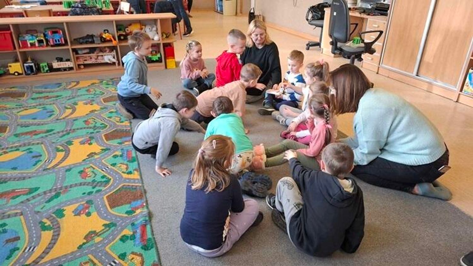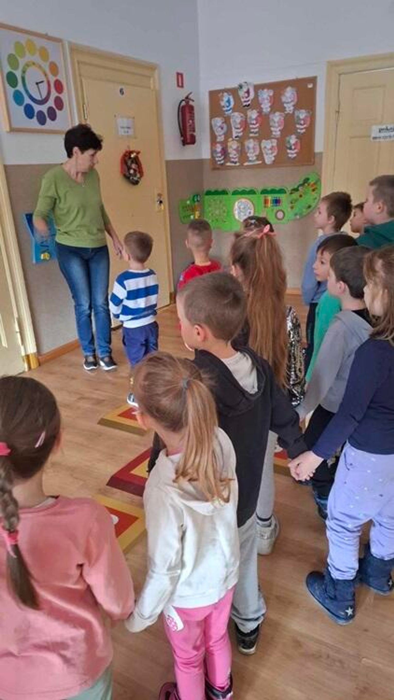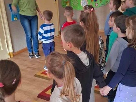 Na samym początku dzieci zwiedziły bibliotekę, sale lekcyjne oraz cały budynek szkoły. Później przedszkolaki zaszły do świetlicy szkolnej, w której pracuje p. Kamila Grabkowska. Pani Kamila odpowiedziała dzieciom, jak wygląda jej praca i wspólnie z p. Bożeną Iwaszkiewicz przeprowadziła dla "Jeżyków" zajęcia plastyczne, doskonalące motorykę małą. Wszystkie dzieci ochoczo zabrały się do pracy, a swojej "dzieła" mogły zabrać do domu.