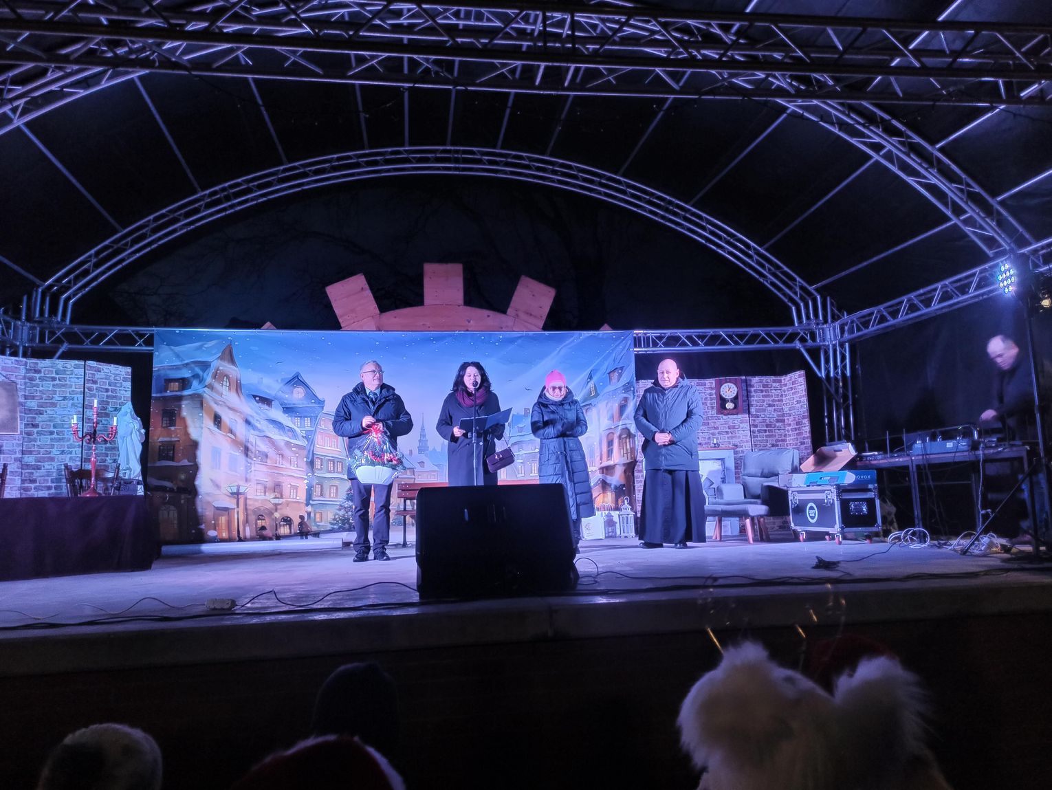 Na scenie amfiteatru zaprezentowały się lokalne talenty – dzieci i młodzież Gminy Młynary, zespół Skała oraz członkowie Koła Gospodyń Wiejskich w Młynarach, którzy przygotowali występy, wprowadzające w świąteczny nastrój i dostarczające wielu wzruszeń i radości. Kulminacyjnym punktem programu był spektakl „Opowieść Wigilijna” w wykonaniu zespołu teatralnego Drabina ze Szkoły Podstawowej w Młynarach. Przejmująca interpretacja klasycznej opowieści Charlesa Dickensa wywarła ogromne wrażenie na widzach, przypominając o duchu Bożego Narodzenia i znaczeniu niesienia pomocy innym. To było niezapomniane przeżycie. GRATULUJEMY pełnego profesjonalizmu.