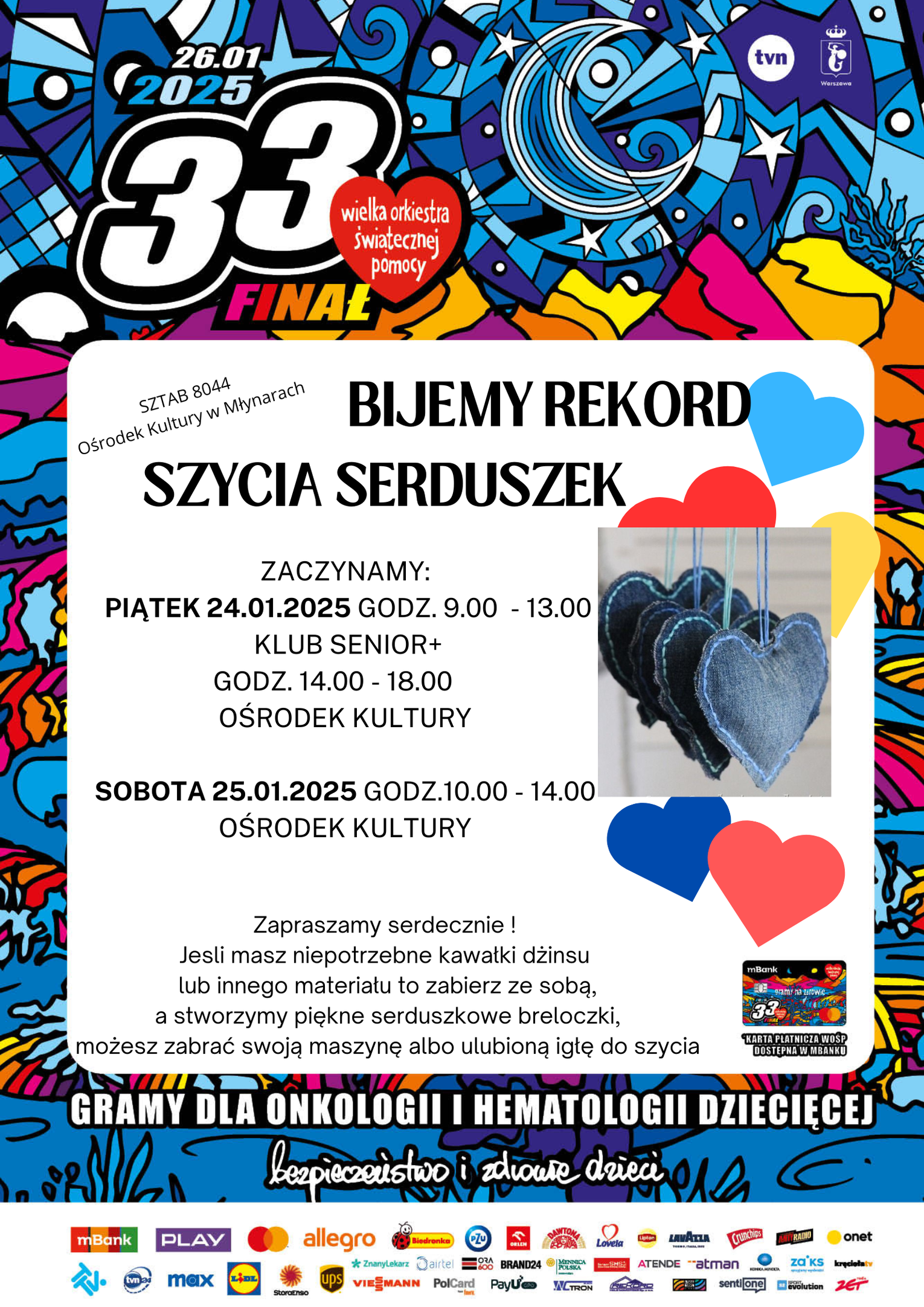 Zapraszamy do wspólnego bicia rekordu szycia serduszek. Nie musisz umieć szyć. Możesz wycinać, wypychać, liczyć, albo zapełniać puszkę WOŚP
