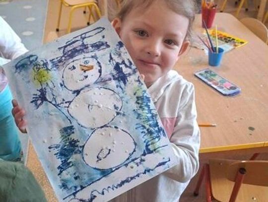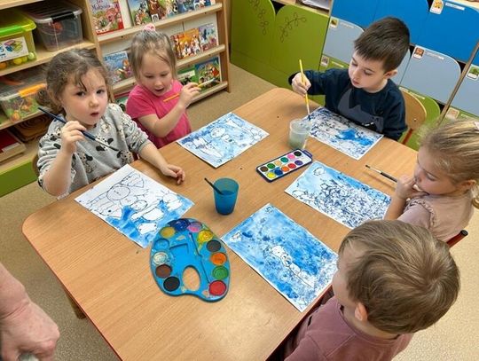Dzieci tworzyły piękne zimowe obrazki za pomocą kalki i farb akwarelowych. Była to już trzecia wizyta pana Bogdana w naszym przedszkolu i zapewne nie ostatnia, gdyż zajęcia plastyczne wyzwalają u dzieci ekspresję, pobudzają rozwój umysłowy i emocjonalny, rozwijają twórczą inicjatywę, pomysłowość, a przede wszystkim wiarę we własne siły.