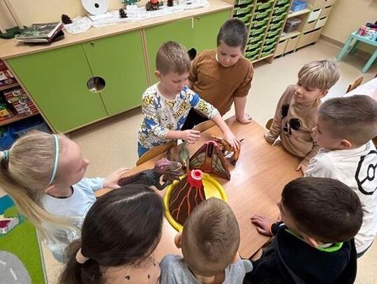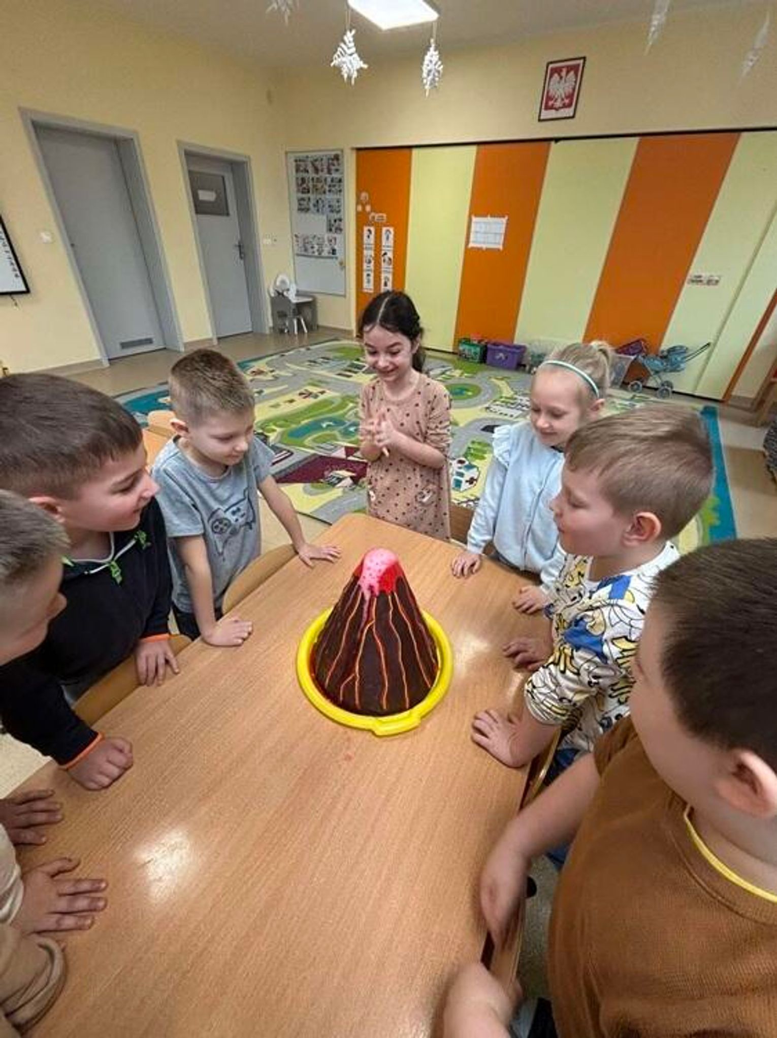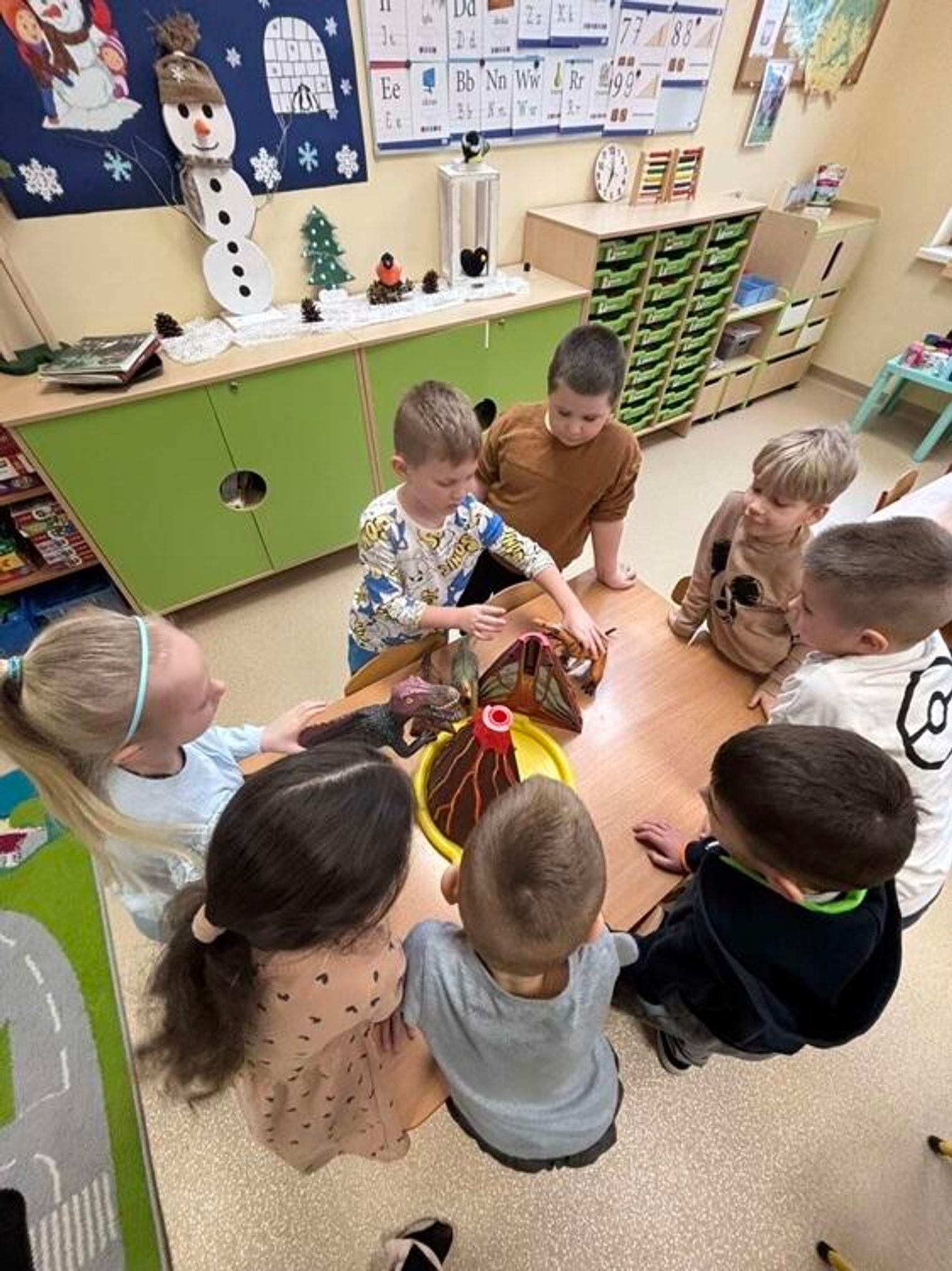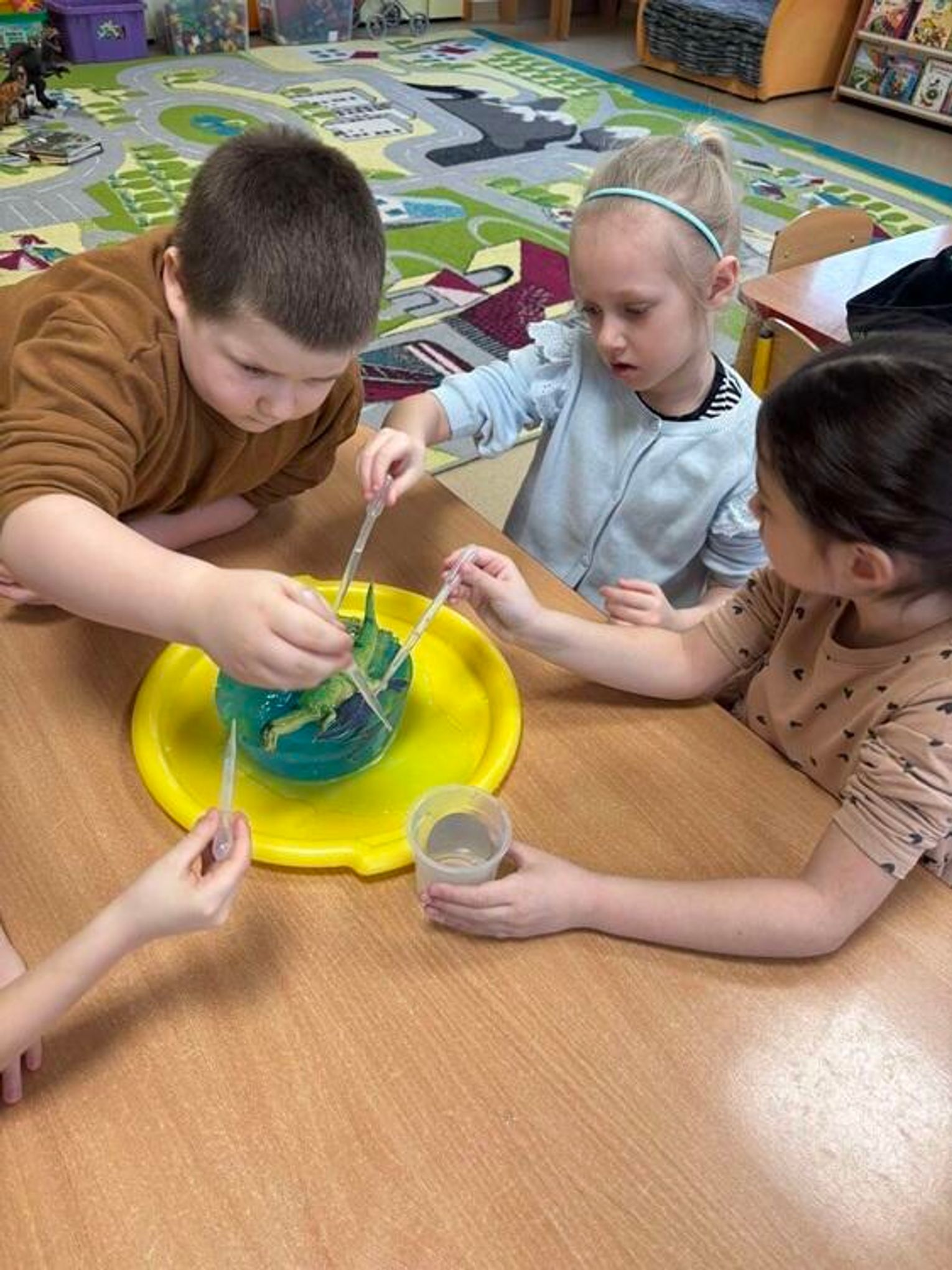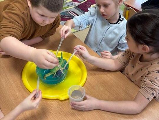 Miłośników prehistorycznych stworów z pewnością nie brakuje w naszym przedszkolu, dlatego dzieci z grupy "Pszczółki” świętowały dziś Dzień Dinozaura. Zajęcia zaczęliśmy od poszerzenia wiedzy na temat życia dinozaurów, ich gatunków i specyfiki żywieniowej. Podyskutowaliśmy również o znanych teoriach wyginięcia tych niesamowitych gadów. Następnie przeszliśmy do działania: przedszkolaki wcieliły się w rolę paleontologów, ale nie kopały w ziemi, tylko próbowały wydostać dinozaury z lodu! Dzięki temu dzieci badały stan skupienia wody oraz jej temperaturę. Oczywiście nie mogło zabraknąć wybuchającego wulkanu! ,,Pszczółki” zapoznały się z jego budową oraz doprowadziły do reakcji chemicznej, dzięki której mogliśmy zobaczyć wielki wybuch.
