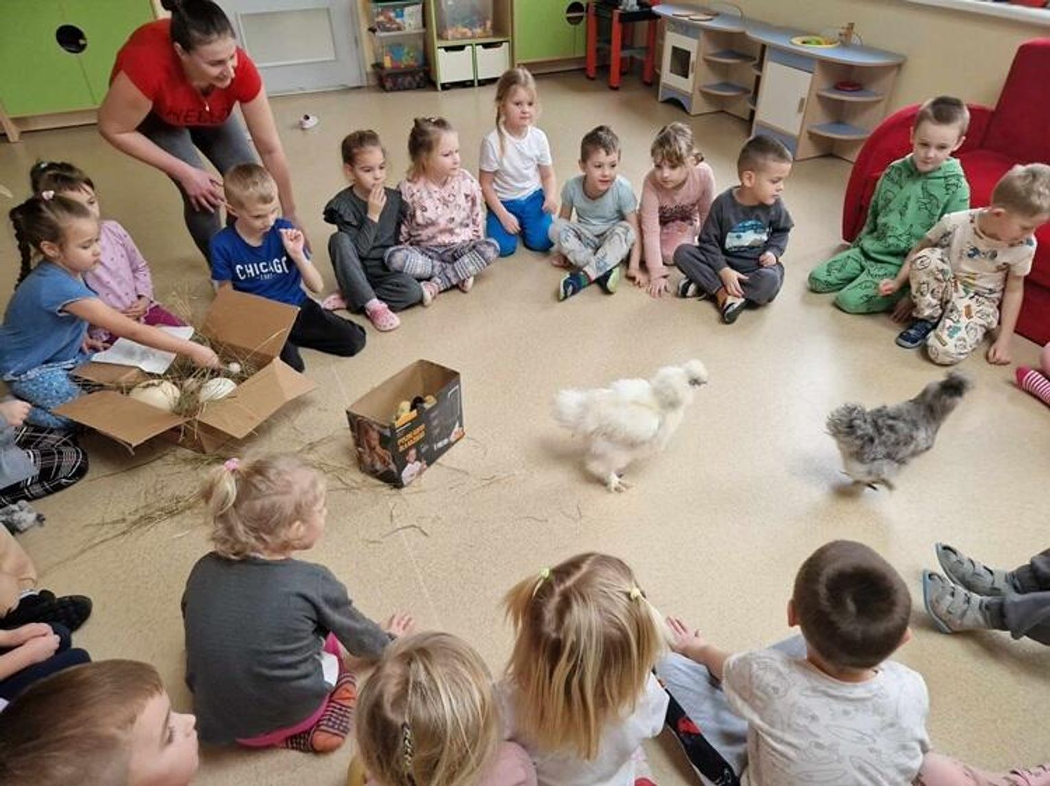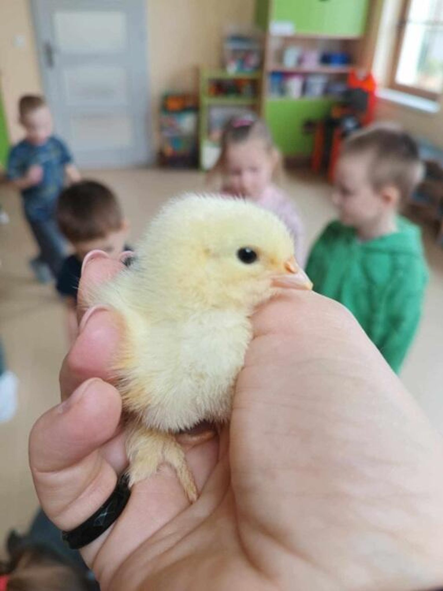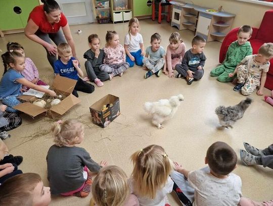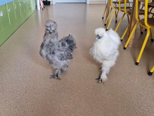 W środę 26 lutego dzieci z grupy "Tygryski" i "Jeżyki" odwiedziły dwie kurki - silki jedwabiste oraz ich pisklęta. Takim nietypowym w dzisiejszych czasach hobby podzieliła sią z nami pani Kasia Semkiw - mama Amelki. Dzięki jej uprzejmości dzieci mogły kurki pogłaskać, wziąć na ręce oraz zobaczyć z bliska pisklęta. Dowiedziały się, jak hodować takie zwierzątka i jak się nimi opiekować.