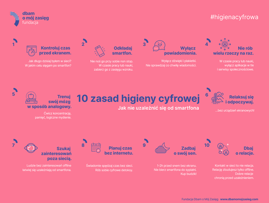 Na stronie internetowej https://dbamomojzasieg.pl znajdziecie Państwo materiały edukacyjne, projekty badawcze i kampanie społeczne o tematyce cyfrowej. Naprawdę warto tam zajrzeć, aby nie tylko uświadomić sobie, jak dużym zagrożeniem są e-uzależnienia, lecz również zrozumieć, jak ważne dla naszego dobrostanu są relacje międzyludzkie!
