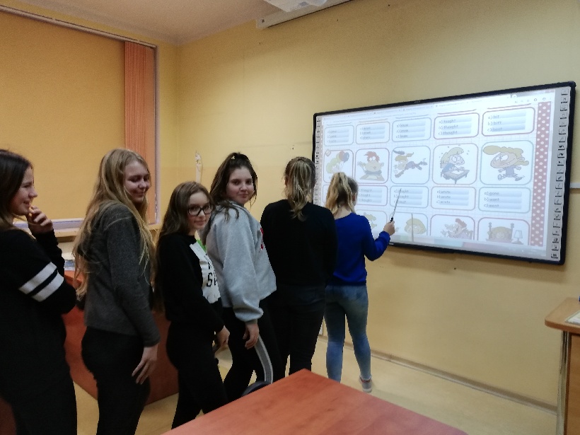 W trakcie zajęć uczniowie poszerzali słownictwo z zakresu: kolory, przybory szkolne, zabawki. Wykonali projekty dot. ulubionej zabawki i zawartości wymarzonego piórnika. Nauczyli się określać zabawki za pomocą podstawowych przymiotników. Utrwalili nazwy podstawowych kolorów, a także otrzymywali kolory pośrednie mieszając ze sobą podstawowe barwy. Poznane słownictwo utrwalali śpiewając piosenki bezpośrednio związane z tematem. Na wszystkich lekcjach uczniowie wykorzystują podręcznik Give me five 1 oraz materiały ucznia. W grupie 2. W trakcie zajęć uczniowie utrwalali słownictwo dotyczące liczb z zakresu 1-20. Uczyli się zadawać pytania i udzielać odpowiedzi dot. samopoczucia. Poszerzali słownictwo dot. rodzajów sportów. Nauczyli się wyrażać preferencje dot. danych sportów. Poznali wyrażenia dot. wyrażania propozycji zabaw. Na wszystkich lekcjach uczniowie wykorzystują podręcznik Give me five 3 oraz materiały ucznia. W grupie 3. Podczas zajęć uczniowie poznali odmianę czasownika have got oraz to be. Nauczyli się stosować właściwe w formy czasowników w zdaniach. Kształcili umiejętność mówienia w języku angielskim. Nauczyli się podawać podstawowe informację na swój temat (imię, wiek, miejsce zamieszkania, umiejętności, preferencje). Poszerzali słownictwo związane z częściami ciała. Wykonywali projekty dot. wyimaginowanej postaci. Na wszystkich lekcjach uczniowie wykorzystują podręcznik Give me five 4 oraz materiały ucznia. W grupie 4 uczniowie kształcili umiejętność mówienia w języku angielskim. Podczas zajęć utrwalili podstawowe zwroty, wykorzystywane w życiu codziennym. Nauczyli się podawać podstawowe informację na swój temat (imię, wiek, miejsce zamieszkania, umiejętności, preferencje). Poszerzali słownictwo z zakresu przymiotników. Nauczyli się stopniować przymiotniki. Stworzyli plakat promujący wybrany przez siebie produkt, wykorzystując przy tym umiejętność stopniowiania przymiotników. Na wszystkich lekcjach uczniowie wykorzystują podręcznik Give me five 6, oraz materiały ucznia. W grupie 5 podczas zajęć uczniowie utrwalili zasady stosowania czasu present Simple i present continuous. Wykonywali zadania interaktywnie i wersji papierowej. Poszerzali słownictwo z zakresu dom. Wykonali projekt dot. wymarzonego pokoju. Ćwiczyli zasady stopniowania przymiotników wykorzystując oprogramowanie Didakta. Na lekcjach uczniowie wykorzystują podręcznik Repetytorium ósmoklasisty oraz materiały ucznia.