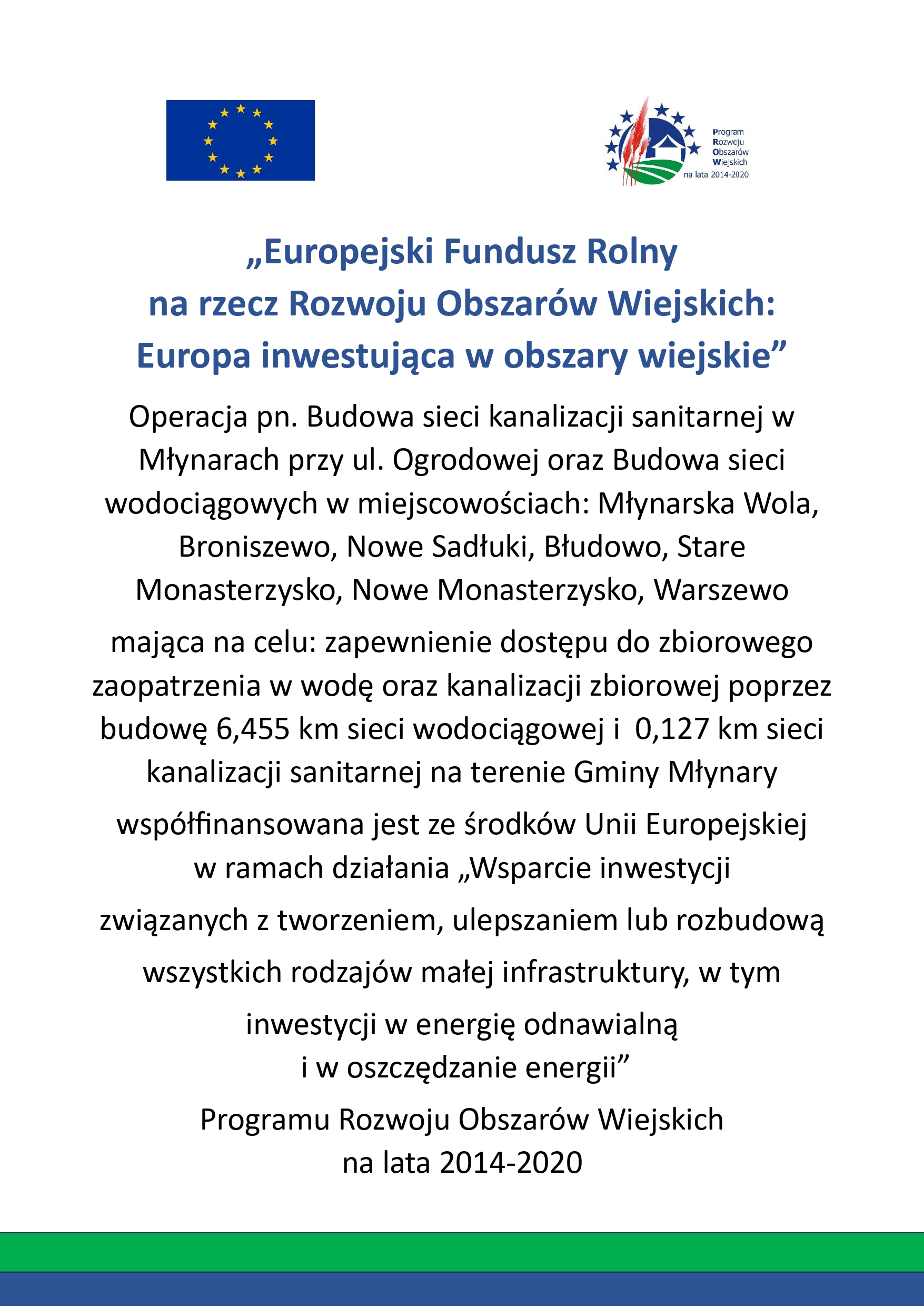 Projekt pn. Budowa sieci kanalizacji sanitarnej w Młynarach przy ul. Ogrodowej oraz Budowa sieci wodociągowych w miejscowościach: Młynarska Wola, Broniszewo, Nowe Sadłuki, Błudowo, Stare Monasterzysko, Nowe Monasterzysko, Warszewo polega na budowie 6,455 km sieci wodociągowej i 0,127 km sieci kanalizacji sanitarnej.