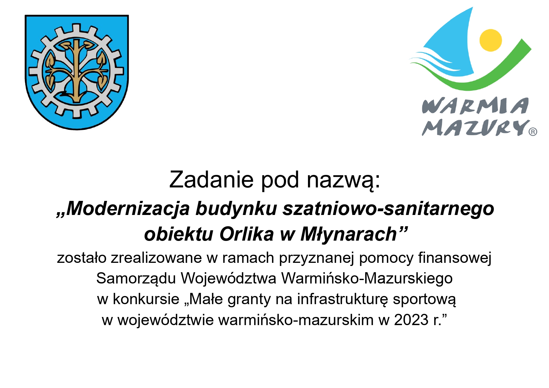 Na realizację zadania uzyskano dofinansowanie ze środków Województwa Warmińdko-Mazurskiego w ramach konkursu Małe Granty na infrastrukturę sportową w Województwie Warmińsko-Mazurskim w 2023 r.” w kwocie 35 000,00 zł