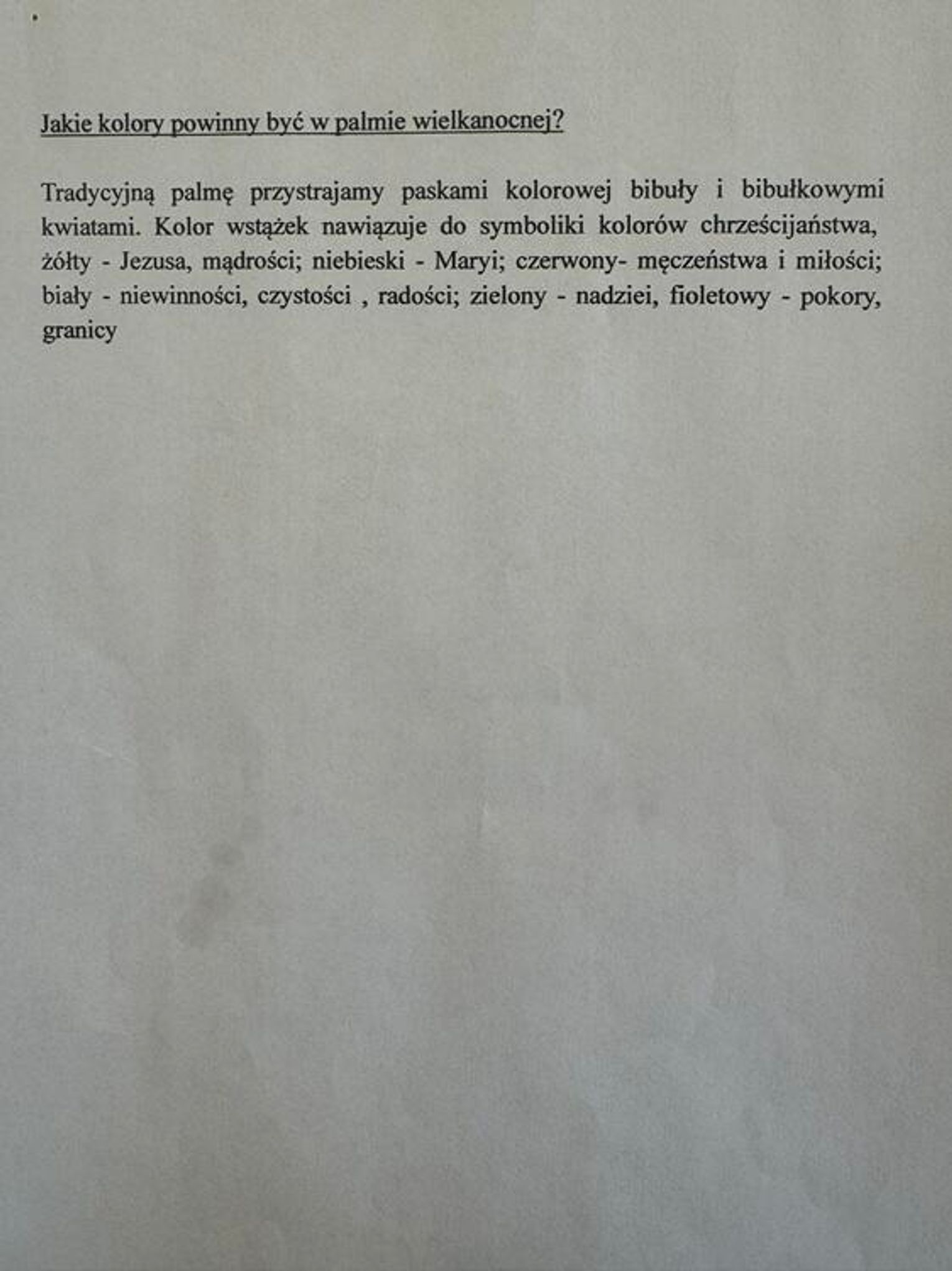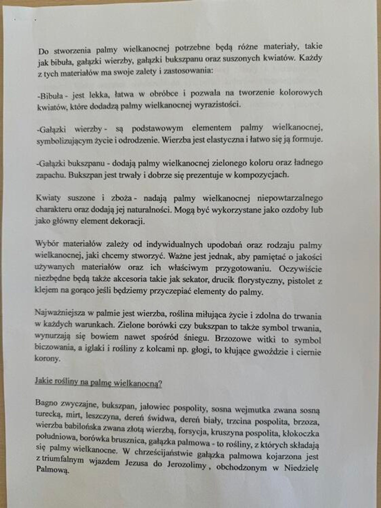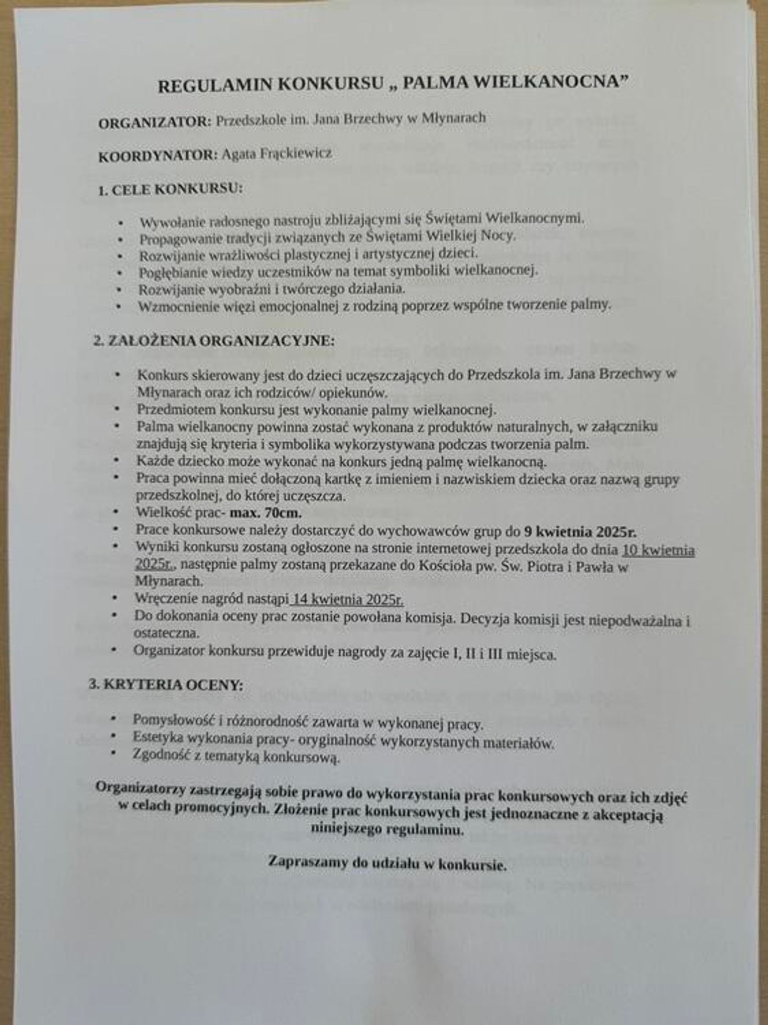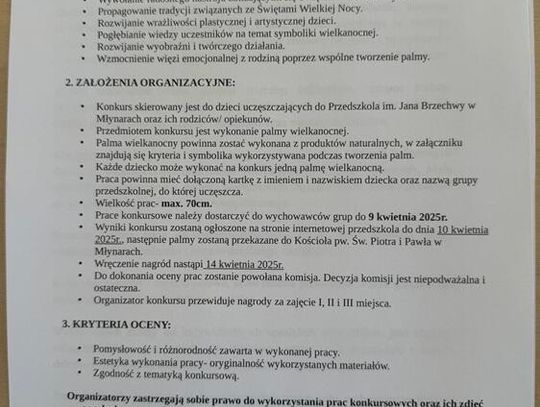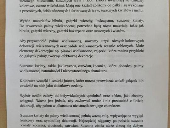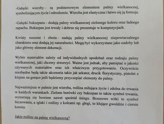Przedmiotem konkursu jest wykonanie palmy wielkanocnej - regulamin konkursu oraz wytyczne dotyczące dopuszczalnych materiałów i symboliki poszczególnych elementów znajdują się w galerii.