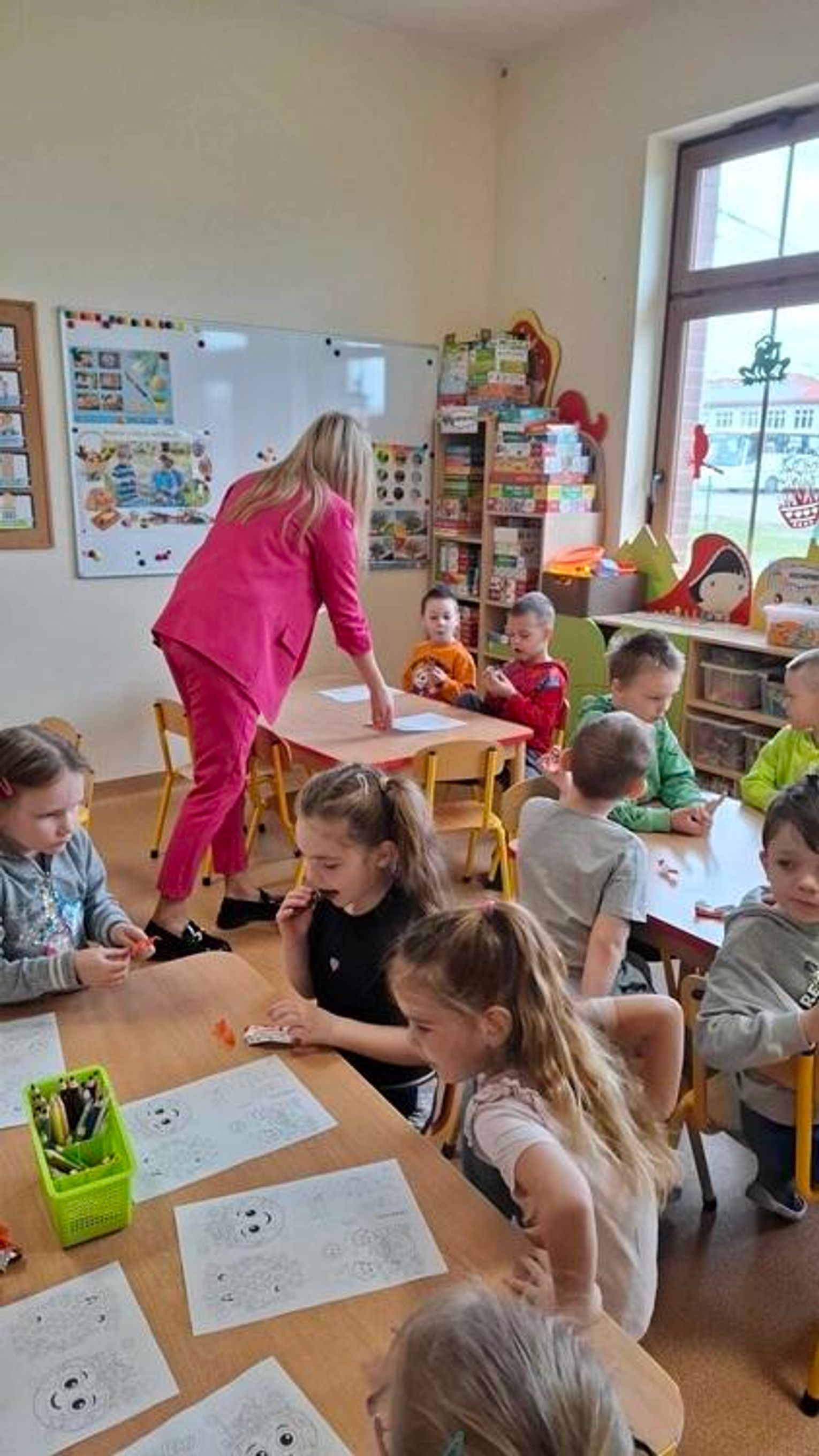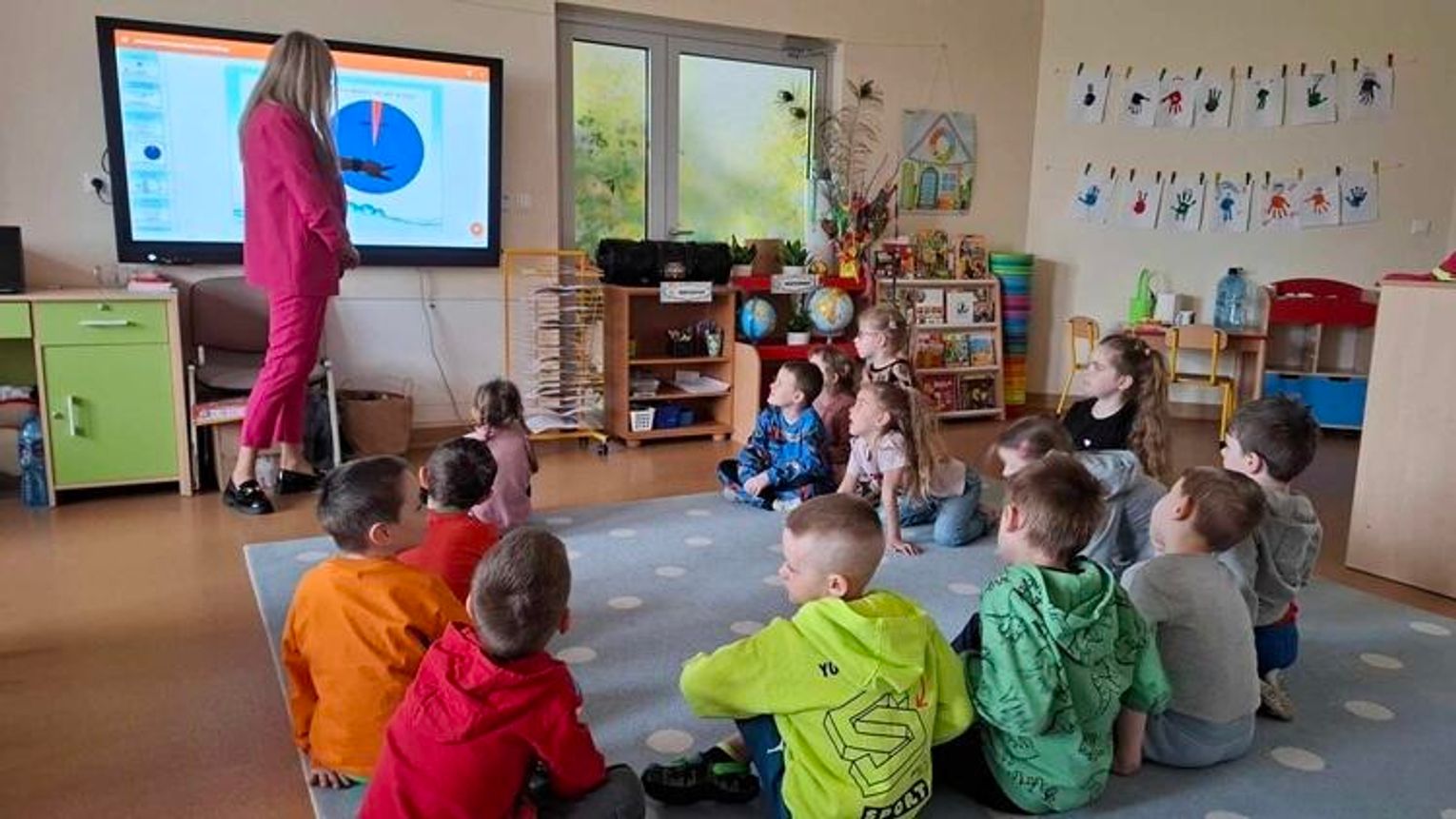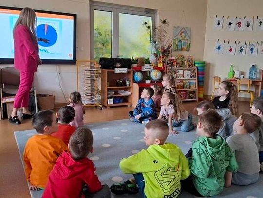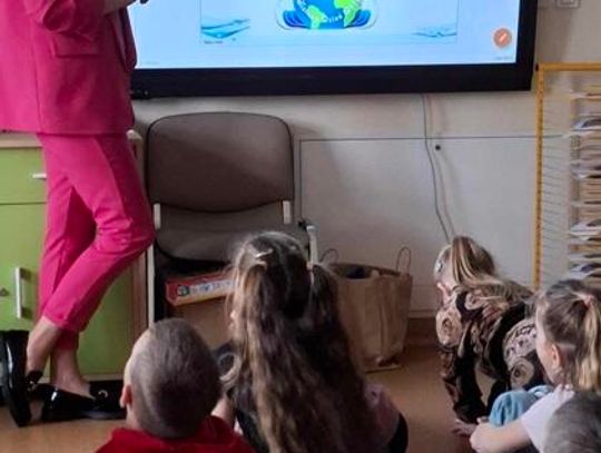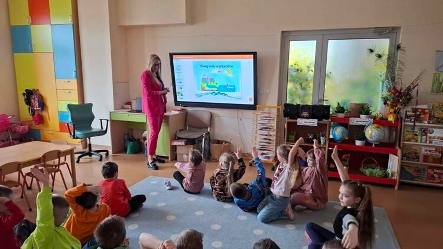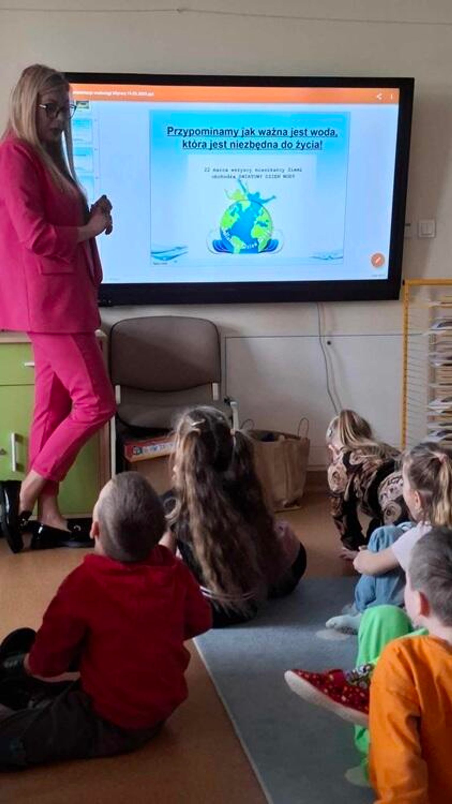P. Sylwia przygotowała dla przedszkolaków ciekawą prezentację na temat wody. W trakcie jej przedstawiania przypomniała dzieciom m.in. o tym, że woda jest niezbędna człowiekowi do życia i że pokrywa 3/4 powierzchni naszej planety, a także opowiedziała o tym, skąd bierze się woda, która leci z naszego kranu. P. Sylwia zaprezentowała również, jak wygląda obieg wody w przyrodzie i wyjaśniła, dlaczego warto oszczędzać wodę. "Jeżyki" z zaciekawieniem słuchały naszego gościa i zadawały wiele pytań, na które p. Sylwia z chęcią odpowiadała.