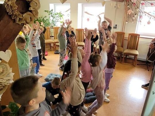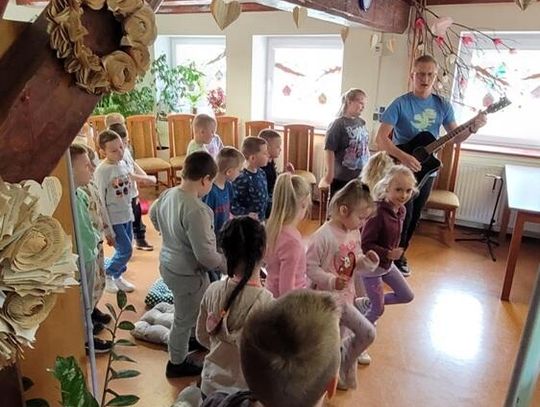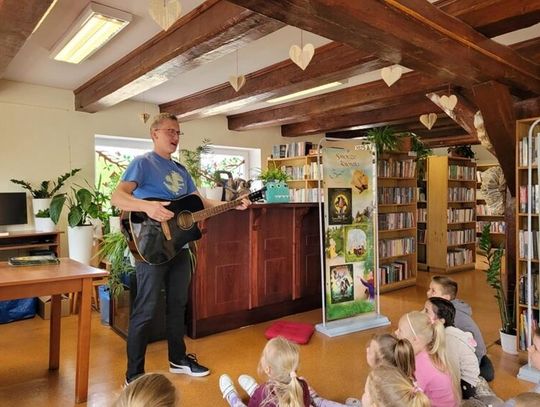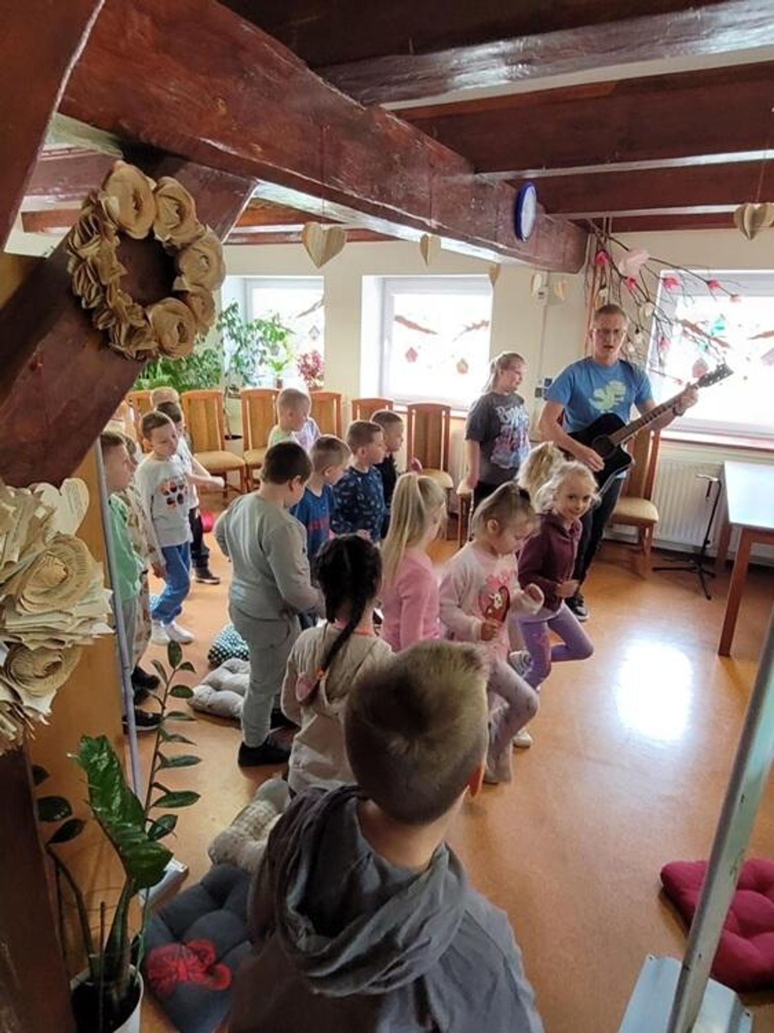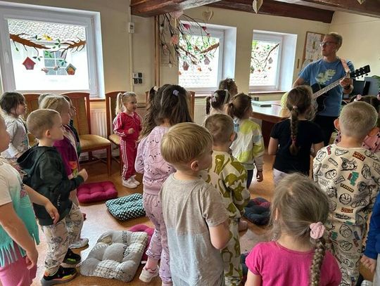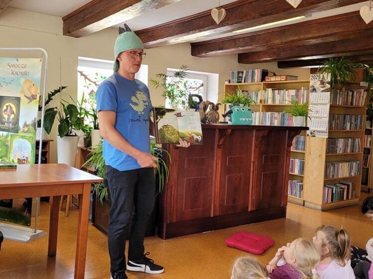 Pan Paweł zaprezentował dzieciom w formie mini teatrzyków wiersze pt. "Zawodowiec" i "W warsztacie stolarskim", próbował straszyć je smokami (ale nic z tego nie wyszło...), a nawet zagrał na gitarze i zaśpiewał (bardzo ładnie!).