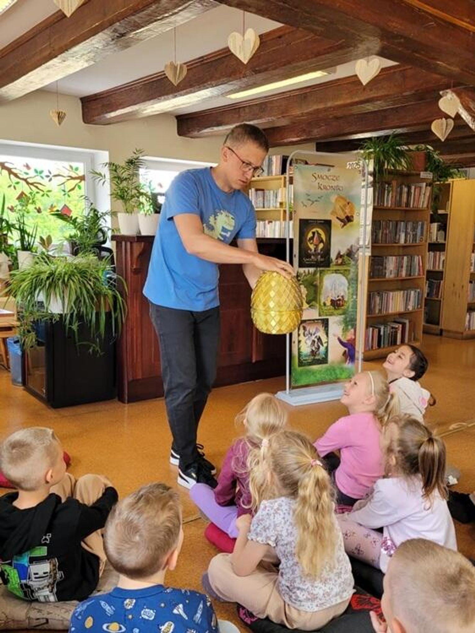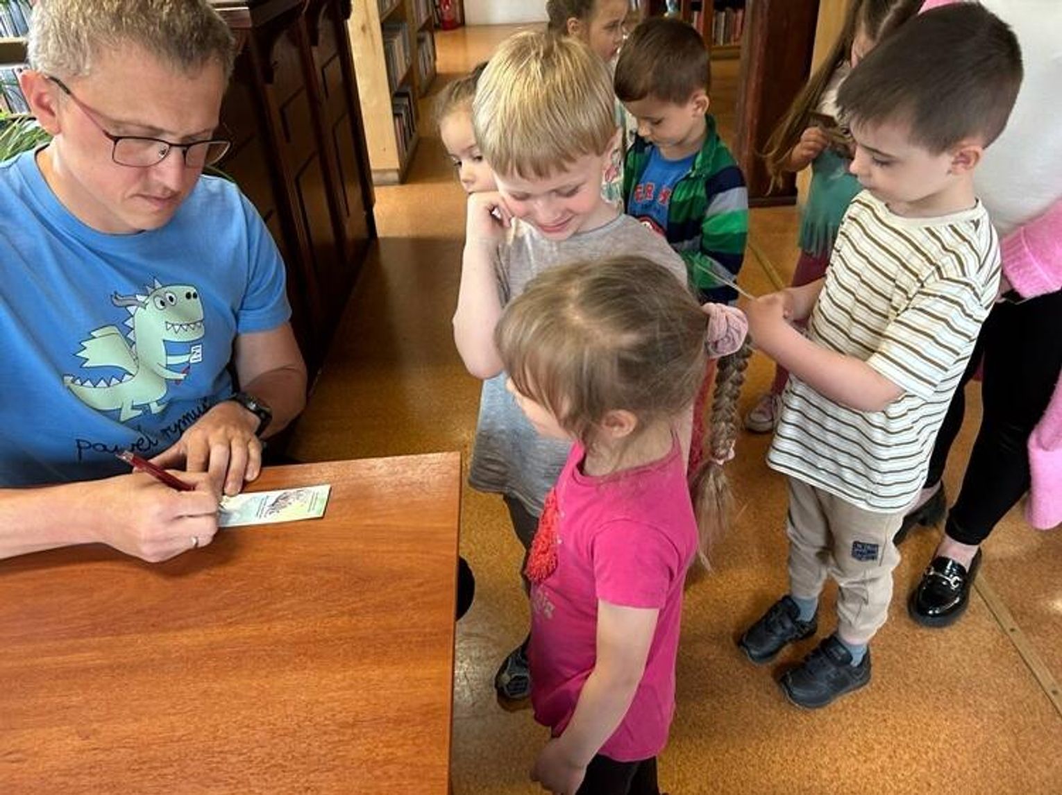 Na zakończenie Pan Paweł przeczytał przedszkolakom fragment swojej pierwszej książki z serii „Smocze kroniki”, czyli „Smocze jajo”, który bardzo rozbudził ich ciekawość, więc nie było wyjścia - wróciliśmy do przedszkola z całą serią "Smocze kroniki" (z imienną dedykacją i autografem), aby doczytać, jak kończy się ta historia!