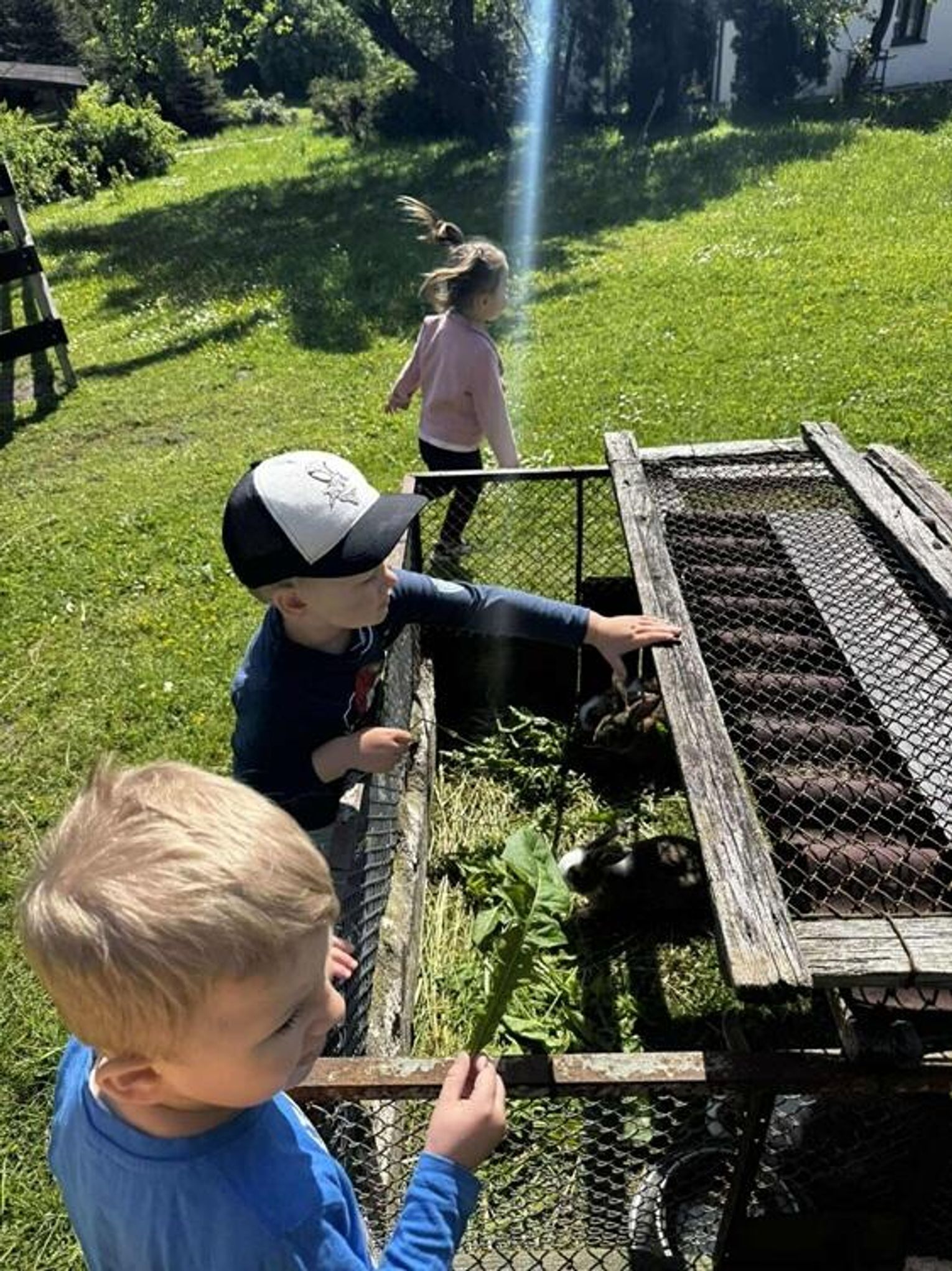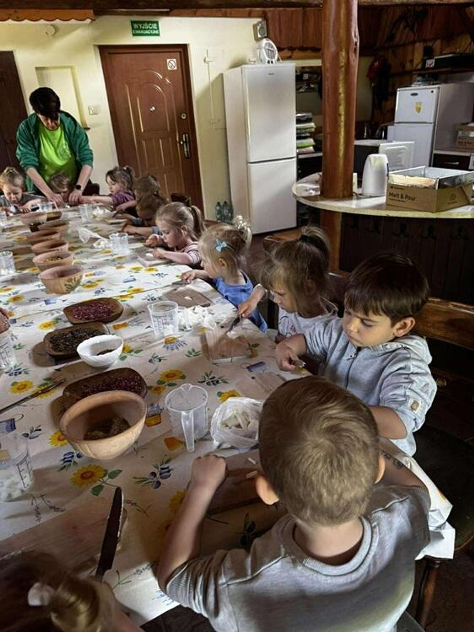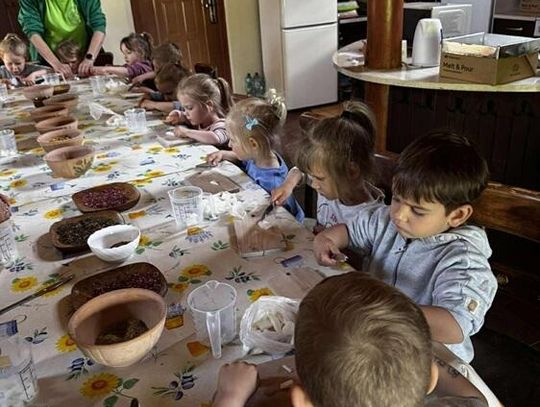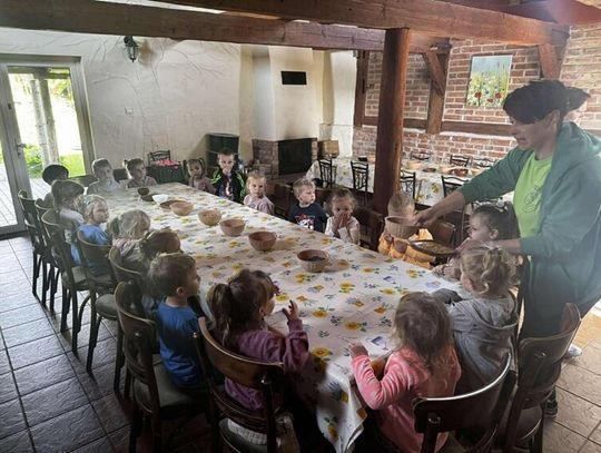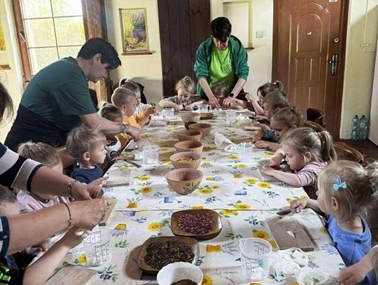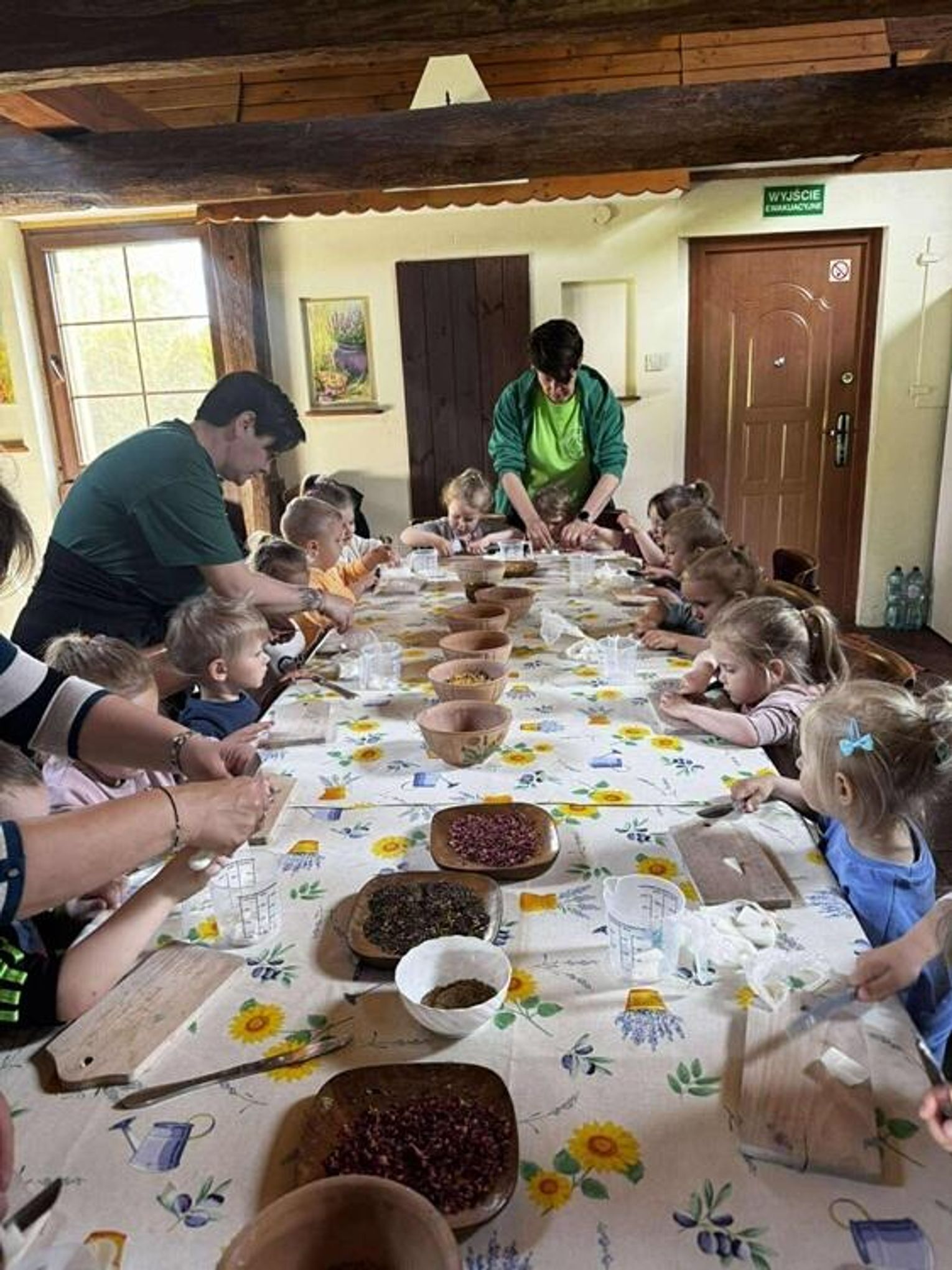 Pobyt w "Ziołowym Dzbanku" rozpoczęliśmy od robienia pięknych, wielobarwnych ziołowych mydełek. Gdy te były już gotowe, udaliśmy się na zwiedzanie Zagrody. Maluchy miały okazję karmić kozy, króliczki oraz kurki. Poznaliśmy też niezwykle upartego osiołka i malutkie kurczaczki. Następnym punktem wycieczki było poznanie ziół i roślin. Dowiedzieliśmy się, jak je uprawiać, na co pomagają oraz mogliśmy skosztować m.in. mięty czekoladowej czy jagody kamczackiej, która jest niezwykle kwaśna, ale i pyszna. Na koniec czekał na nas słodki poczęstunek.
