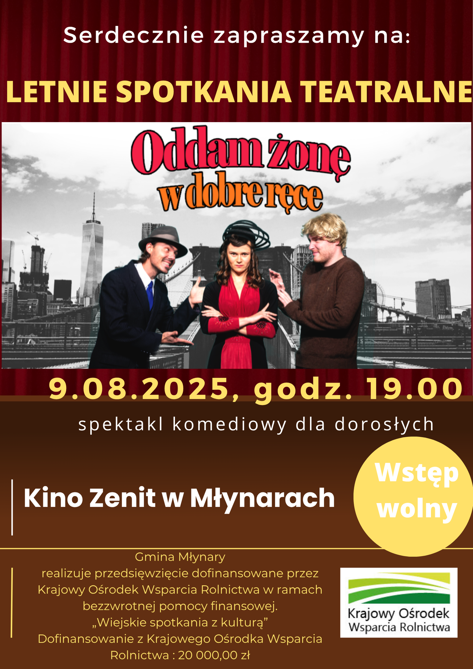 Tradycyjnie w sierpniu zapraszamy dorosłych widzów na spektakl teatralny. Sztuka o wymownym tytule "Oddam żonę w dobre ręce" to gwarancja dobrej zabawy i udanego wieczoru.