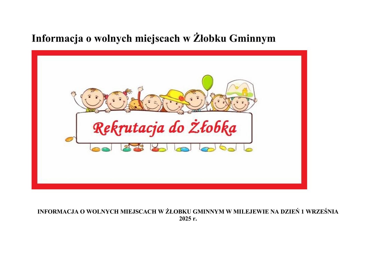 Urząd Gminy Milejewo informuje o posiadaniu wolnych miejsc dla dzieci w Żłobku Gminnym w Milejewie.