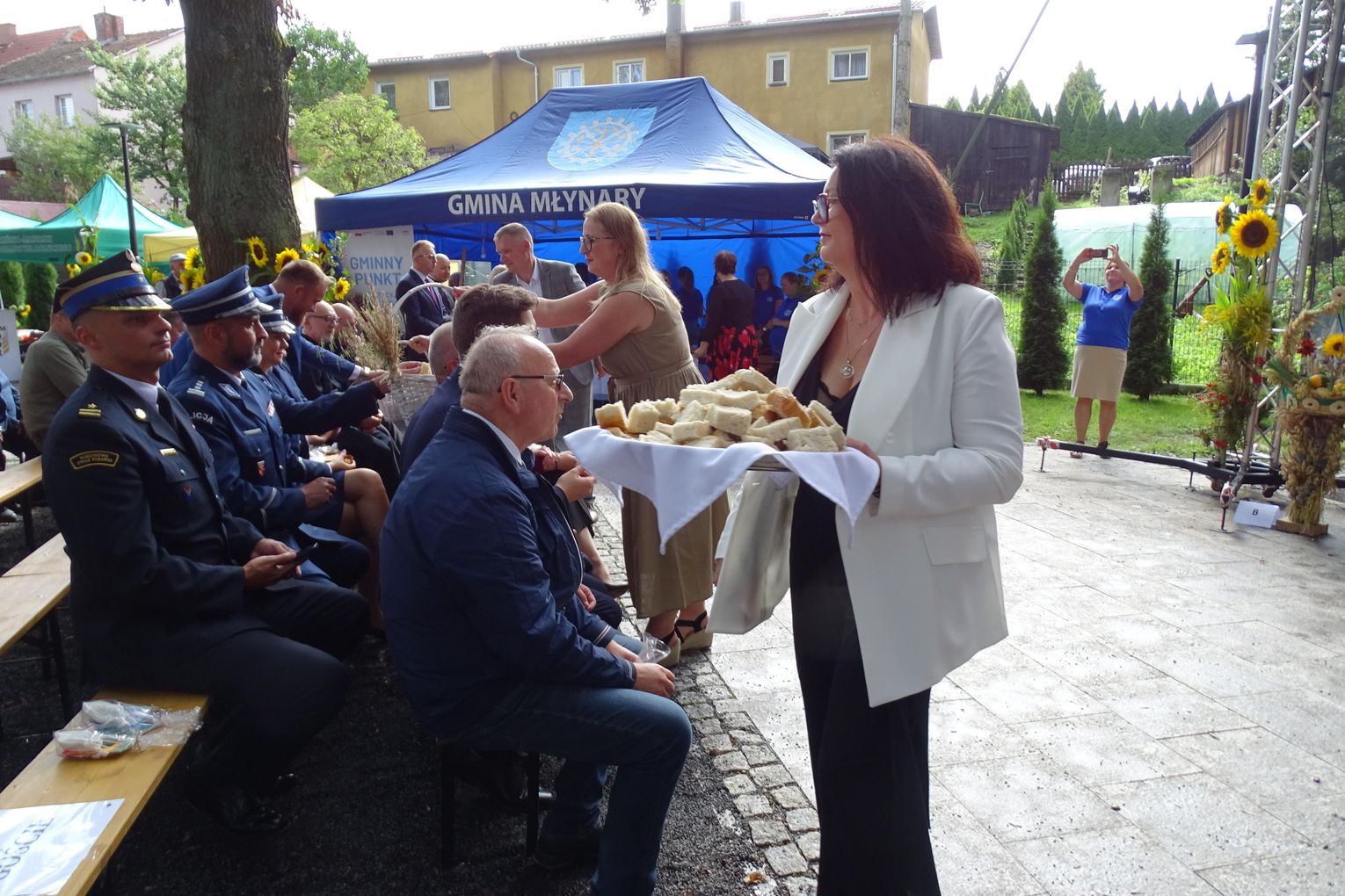 Po nabożeństwie uczestnicy przemaszerowali korowodem do amfiteatru, gdzie odbył się tradycyjny Ceremoniał Dożynkowy. Pani Burmistrz w swoim przemówieniu podkreśliła znaczenie pracy rolników dla całej społeczności, dziękując im za codzienny trud i poświęcenie. Symbolem wdzięczności było dzielenie się chlebem z mieszkańcami.