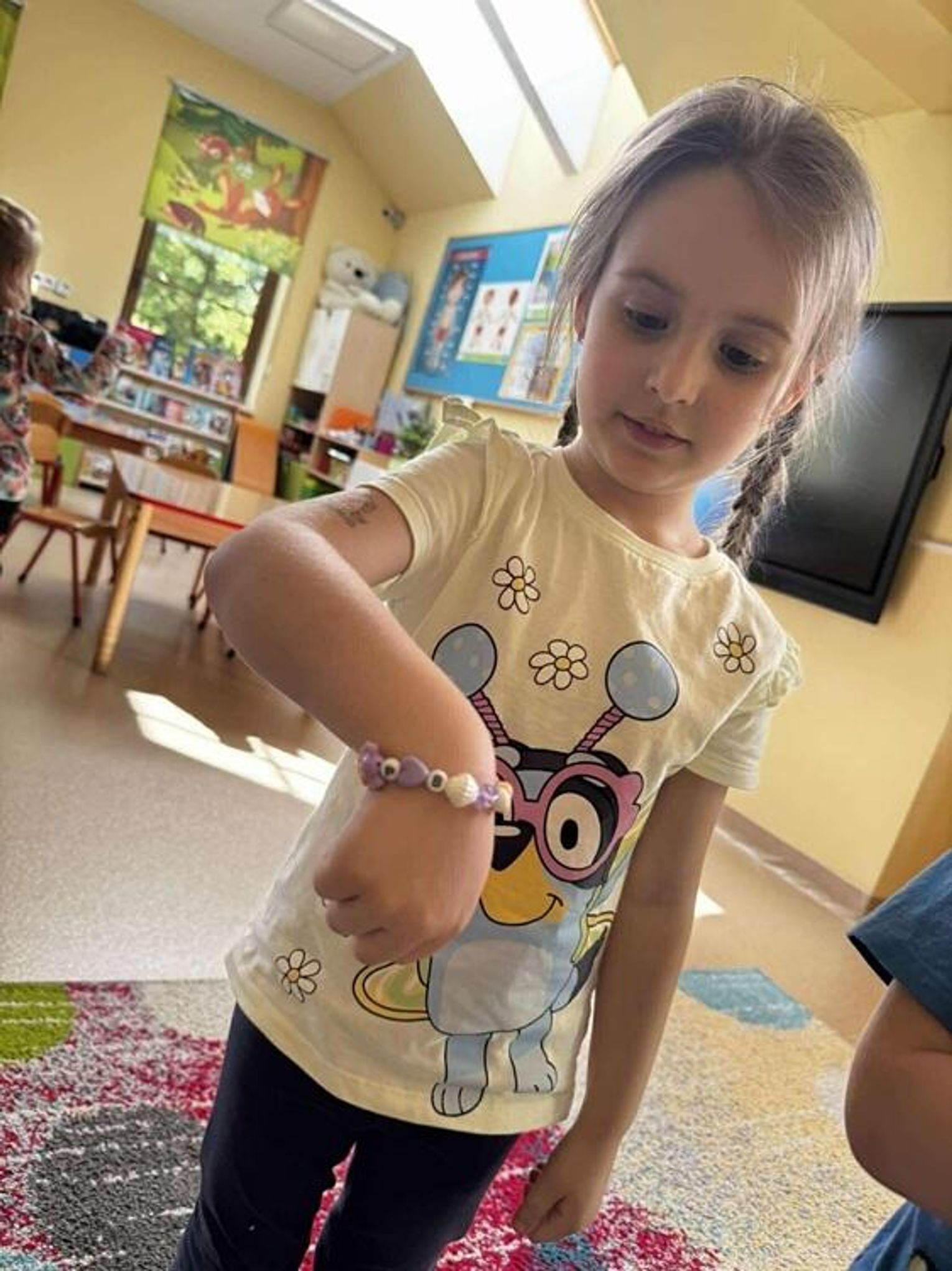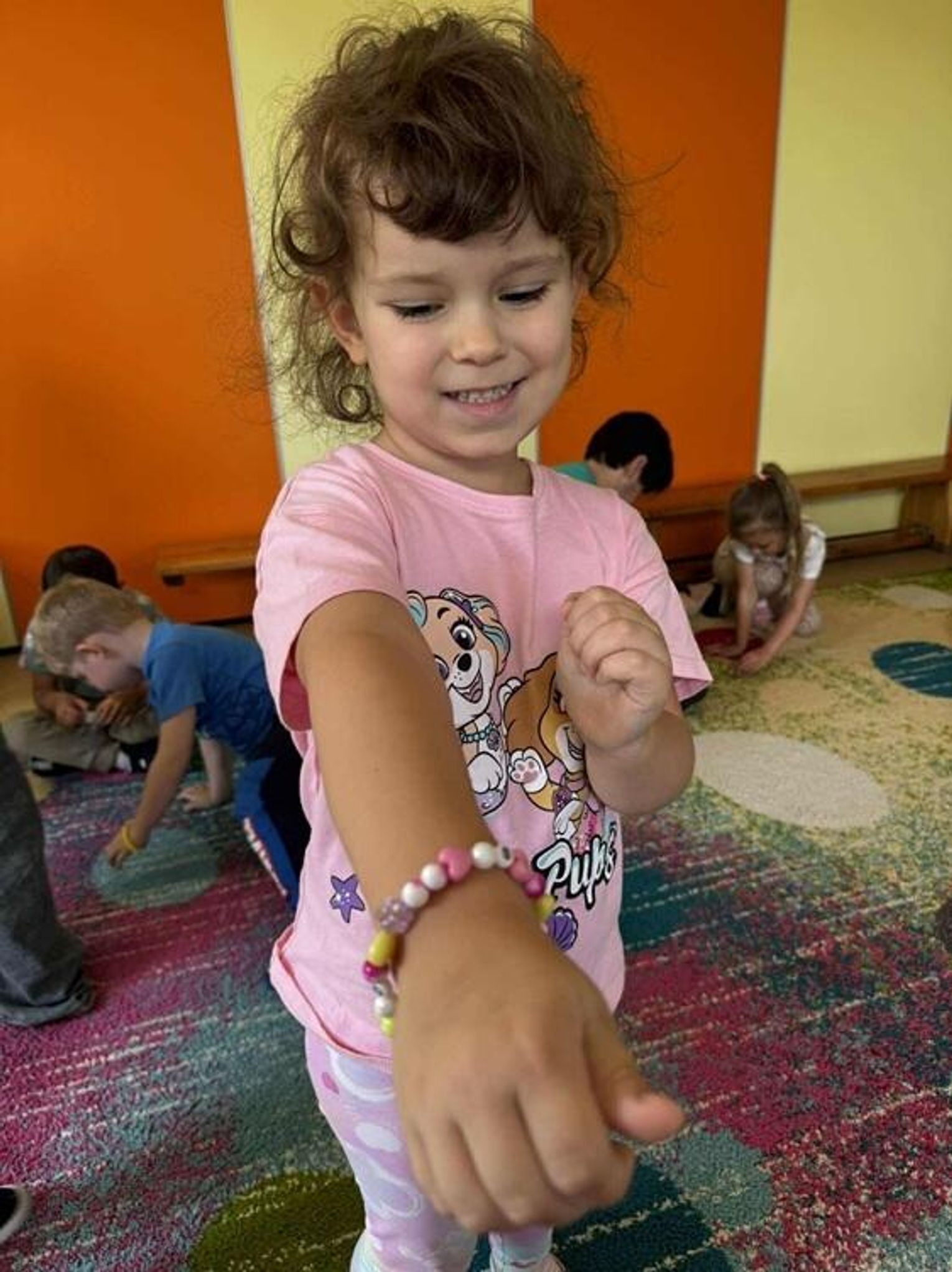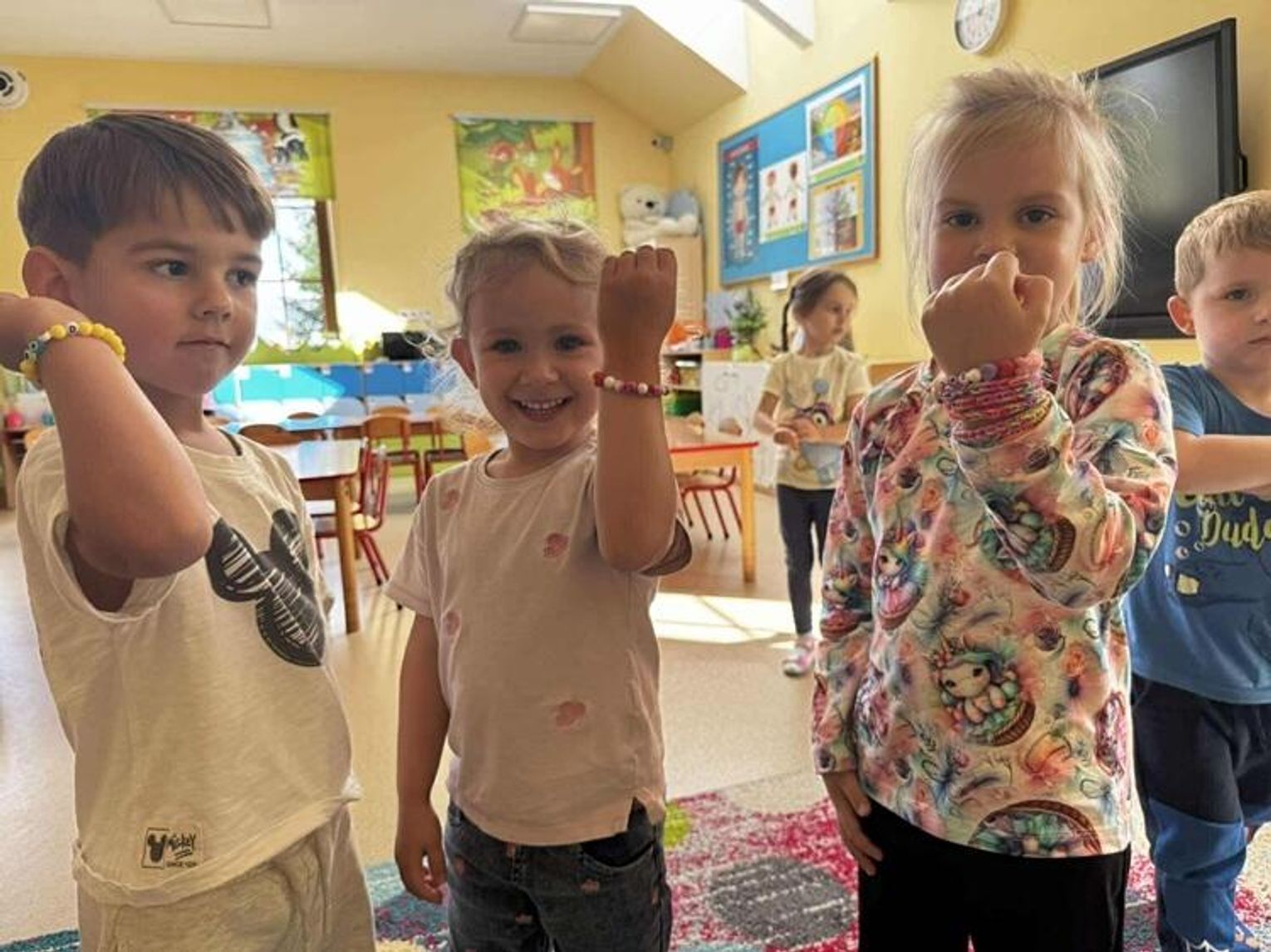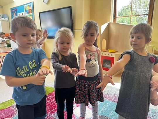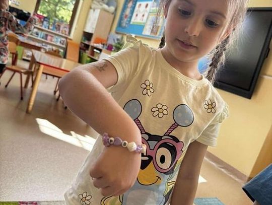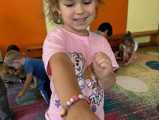 Dziewczynki zaprezentowały swoją pasję, a mianowicie robienie bransoletek. Każde dziecko otrzymało personalizowane koraliki i przy pomocy starszych koleżanek nawlekały je na specjalną nitkę. "Kotki" przy okazji tworzenia pięknej biżuterii mogły również ćwiczyć swoją cierpliwość oraz umiejętność nawlekania. Serdecznie dziękujemy Nikoli i Amelce za wspólnie, kreatywnie spędzony czas.