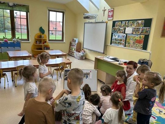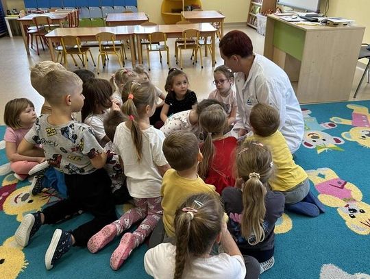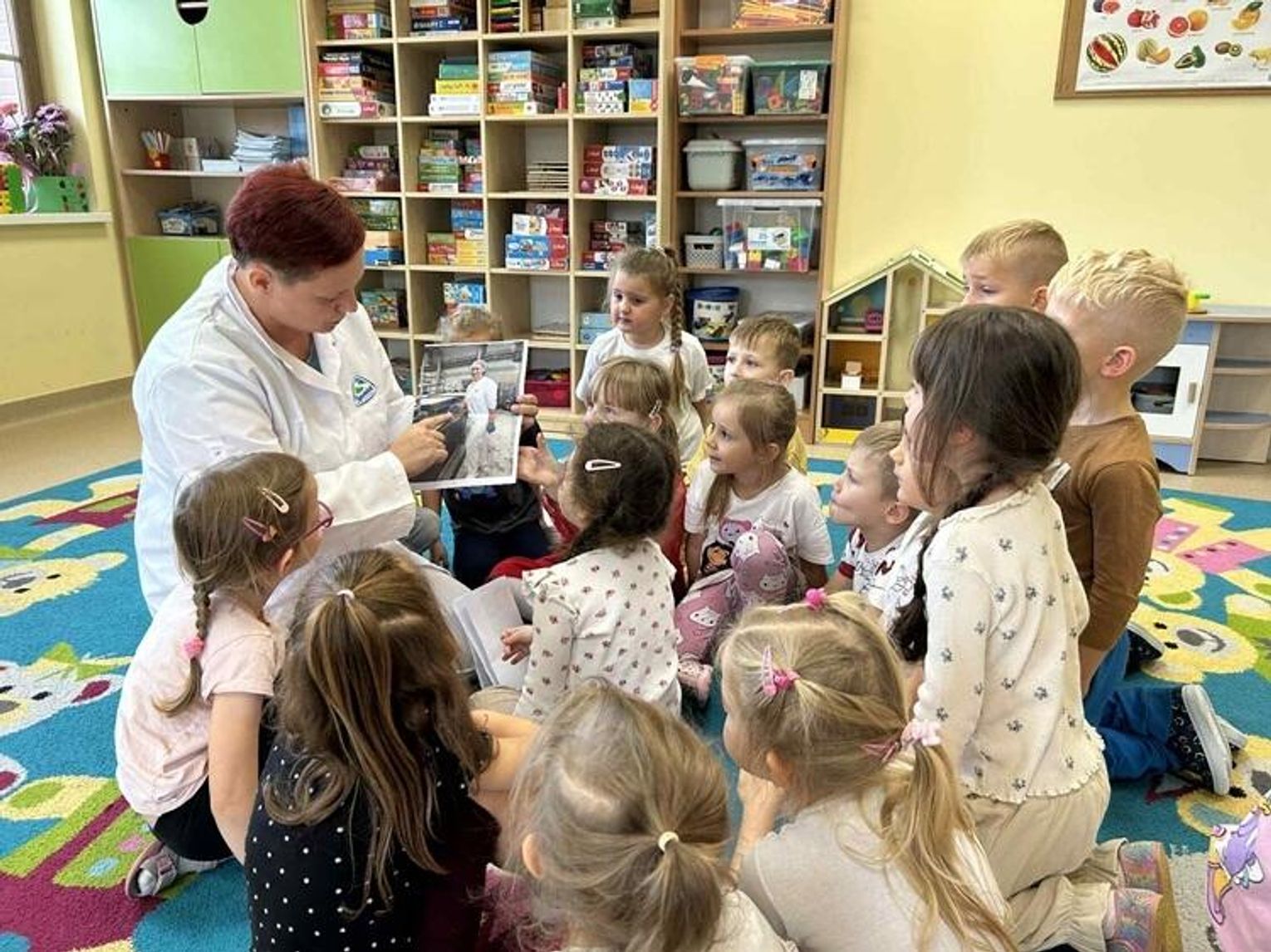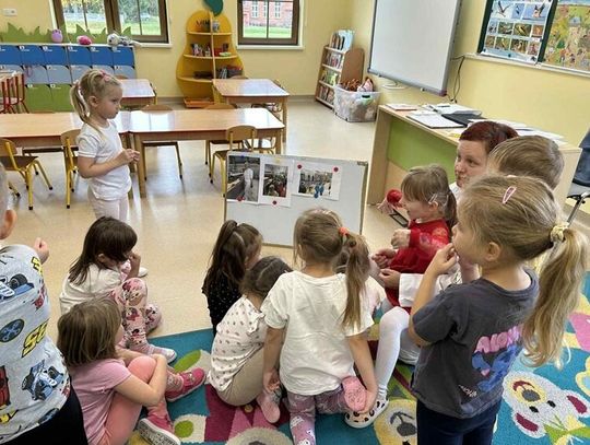 Pani Monika opowiedziała dzieciom, jak powstaje ser, jaki strój nosi pracownik mleczarni i w jakich warunkach odbywa się praca np. w niektórych pomieszczeniach jest bardzo zimno, pracuje się w dzień albo w nocy i pracownik ma kontakt z silnymi środkami myjącymi. Po spotkaniu przedszkolaki stwierdziły, że to jest bardzo ciężka praca!