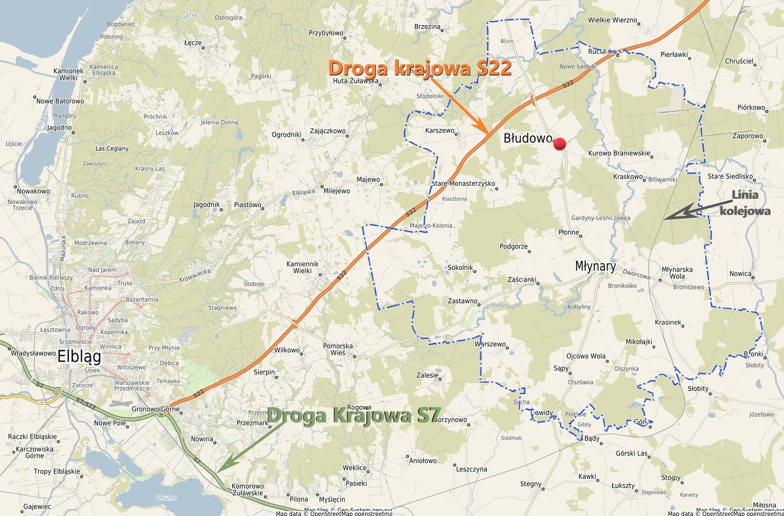 Obręb: Błudowo Nieruchomości położone są we wsi Błudowo w gminie Młynary, które stanowią kompleks oświatowy o łącznej powierzchni 1,2800 ha. Dojazd bezpośredni z drogi publicznej (droga wojewódzka nr 505). Teren działek |