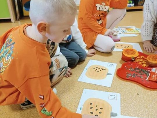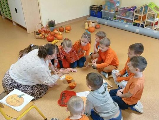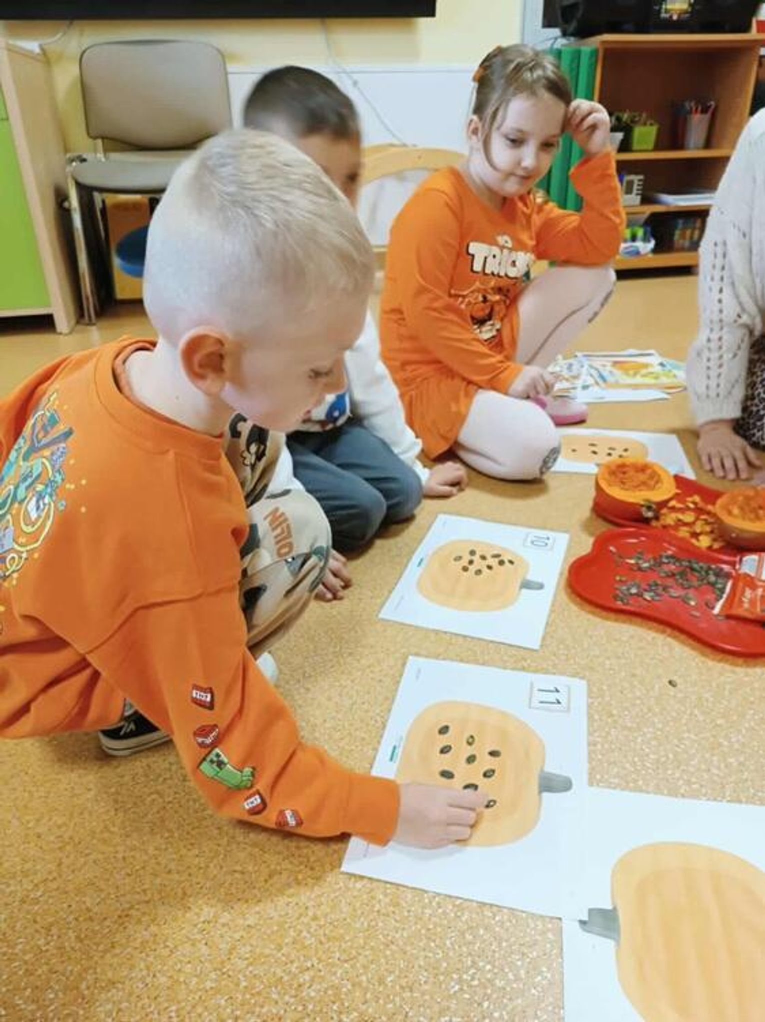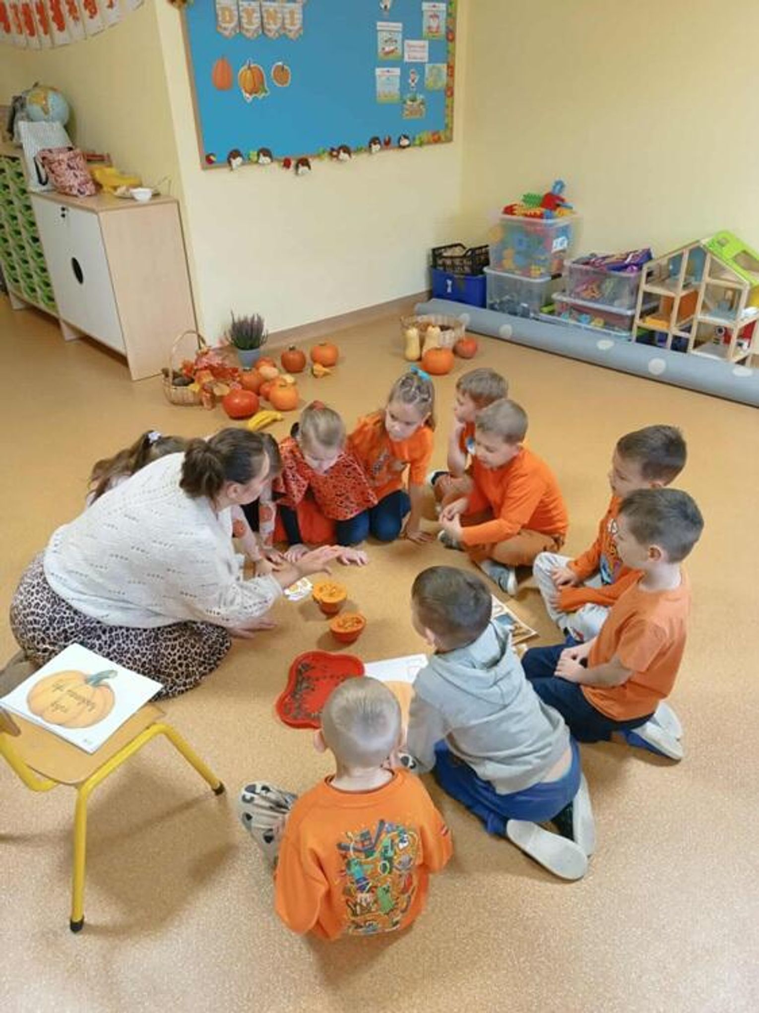 Tego dnia dzieci z grupy "Jeżyki" poznały cykl rozwojowy dyni i dowiedziały się, jakie potrawy można z niej przygotować. Miały okazję skosztować pysznych i zdrowych pestek dyni oraz wykorzystać je do zabaw matematycznych. Nie zabrakło także zabaw ruchowych z dynią przy piosence "Podaj dynię".