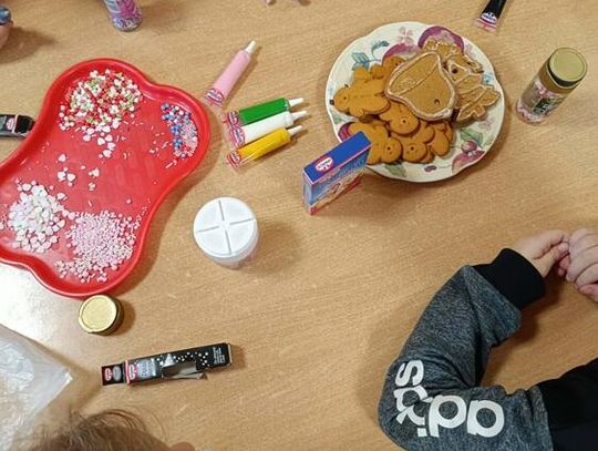 Na stołach pojawił się kolorowy lukier, czekolada, rysiki dekoracyjne oraz pisaki cukrowe, które pomogły nam w samodzielnym dekorowaniu pierników. Każdy piernik wyglądał inaczej - był wyjątkowy i niepowtarzalny. Kiedy skończyliśmy dekorowanie i zapakowaliśmy nasze pierniczki, wspólnie zaśpiewaliśmy kolędę "Przybieżeli do Betlejem".