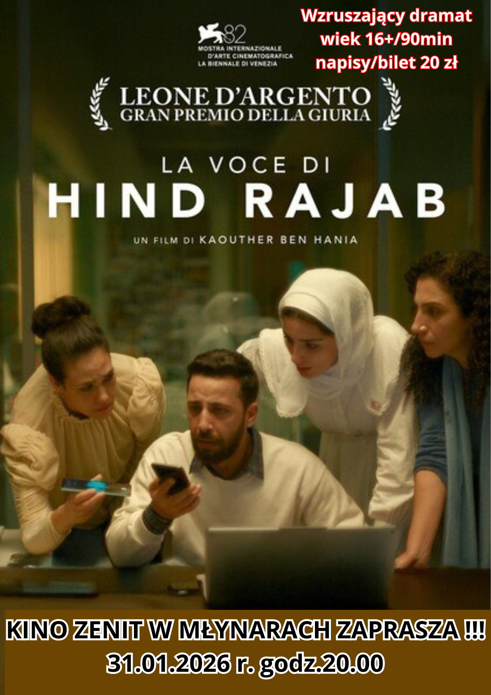 Głos Hind Rajab to film, który oddaje głos tym, którzy często pozostają niewidzialni – ofiarom, ale też ludziom próbującym im pomóc. To opowieść o czekaniu, o odpowiedzialności i o granicach ludzkiej wytrzymałości. Spotkanie to pozwoli spojrzeć na tę historię z perspektywy realnych doświadczeń osoby, która na co dzień działa tam, gdzie stawką jest ludzkie życie. Wzruszająca historia o pracownikach organizacji humanitarnej, którzy 29 stycznia 2024 odebrali telefon alarmowy od 6 letniej dziewczynki uwięzionej pod ostrzałem w samochodzie w Gazie.