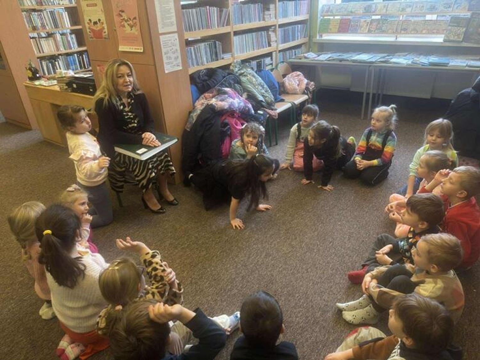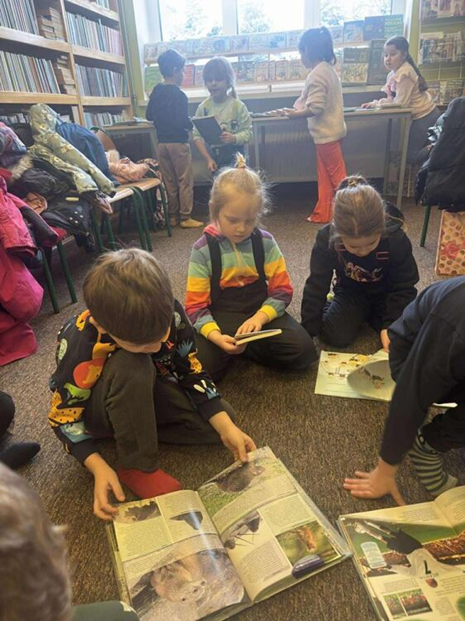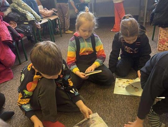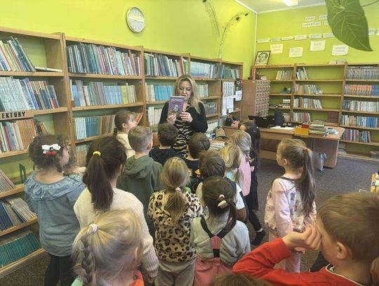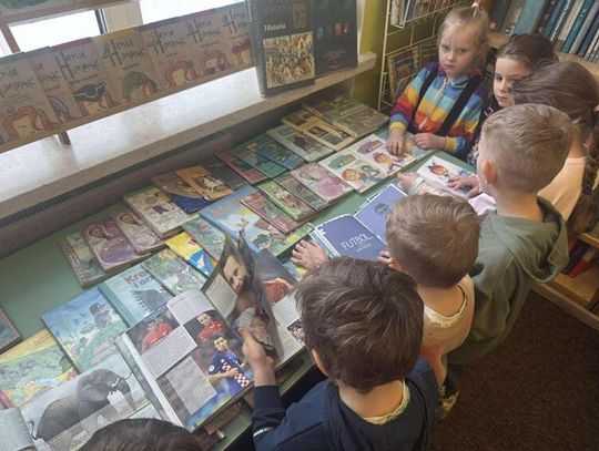 Podczas spotkania z p. Beatą Kucharzewską przedszkolaki dowiedziały się, jak powstaje książka, z czego pozyskiwany jest papier oraz jak wyglądały książki wiele wiele lat temu. Pani Beata opowiedziała dzieciom, jakie działy znajdą w bibliotece oraz w jaki sposób można wypożyczyć książkę. "Tygryski" z ogromnym zainteresowaniem oglądały księgozbiory szkolnej biblioteki. Szczególną uwagę poświęciły książkom o piłkarzach i dinozaurach. Przedszkolaki miały również okazję obejrzeć szkolne kroniki.