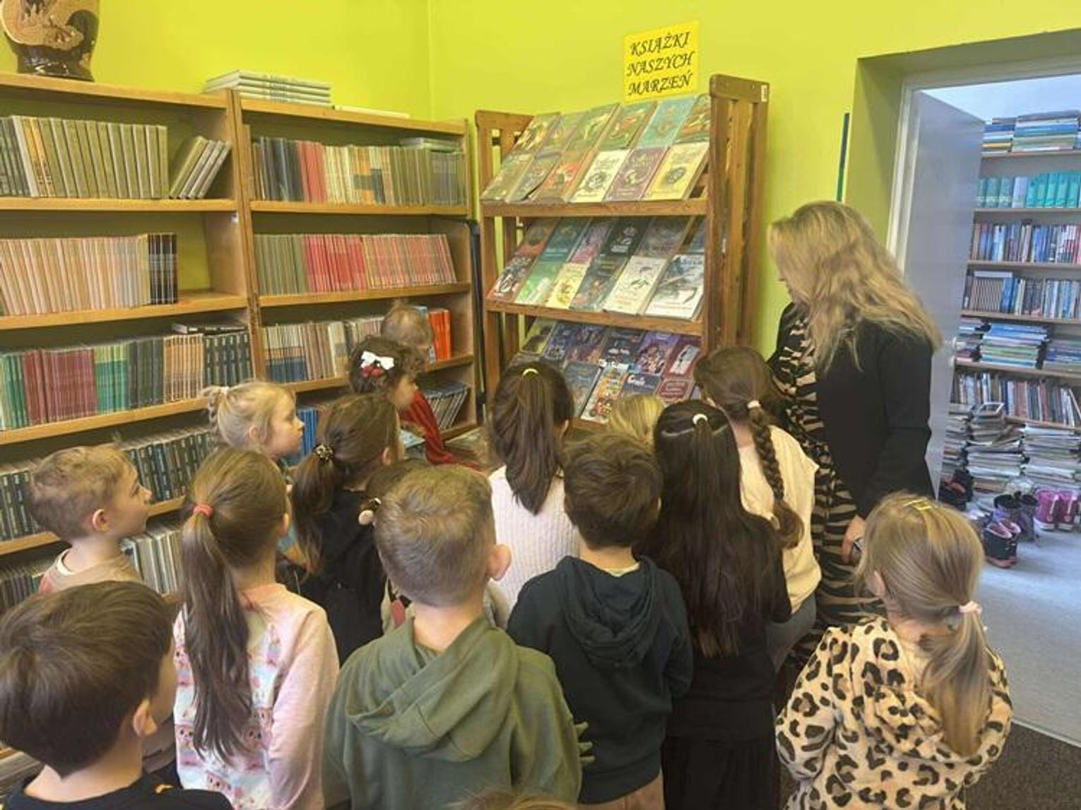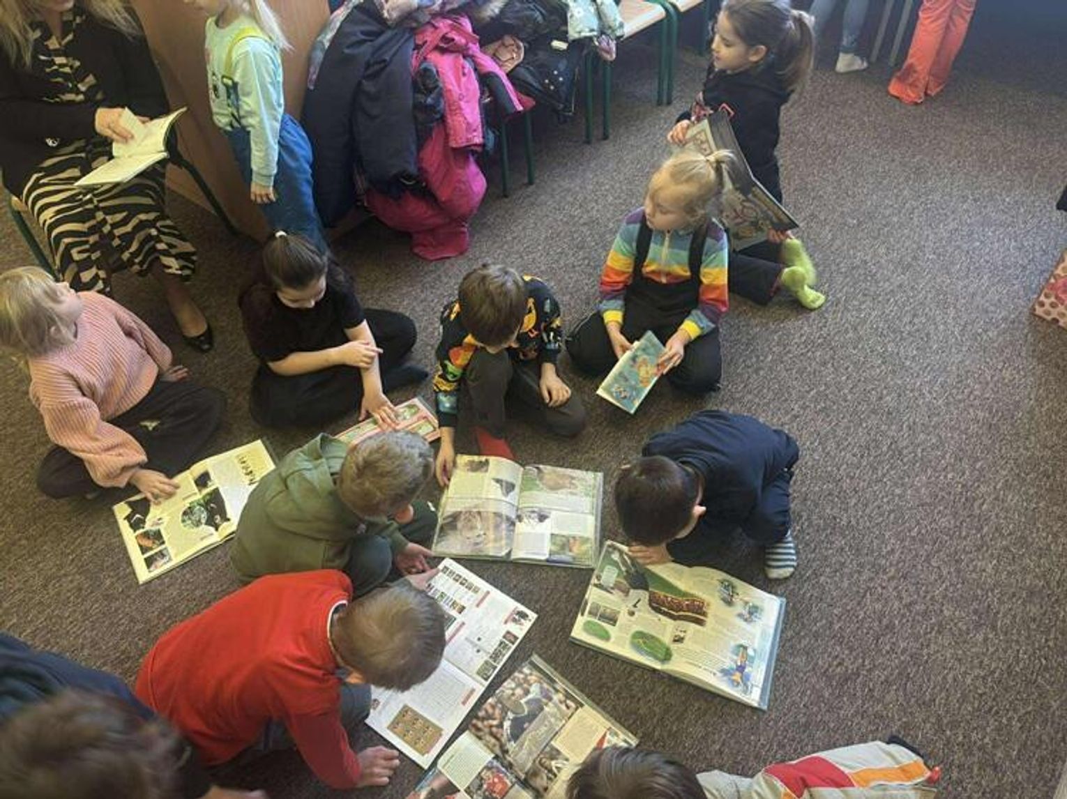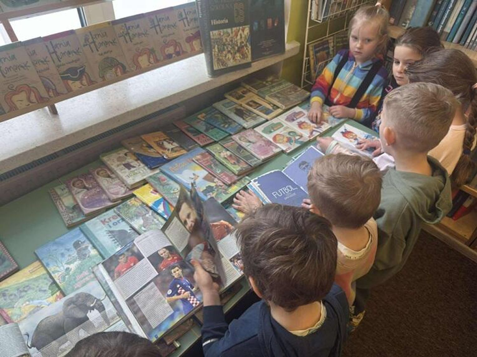 Podczas spotkania z p. Beatą Kucharzewską przedszkolaki dowiedziały się, jak powstaje książka, z czego pozyskiwany jest papier oraz jak wyglądały książki wiele wiele lat temu. Pani Beata opowiedziała dzieciom, jakie działy znajdą w bibliotece oraz w jaki sposób można wypożyczyć książkę. "Tygryski" z ogromnym zainteresowaniem oglądały księgozbiory szkolnej biblioteki. Szczególną uwagę poświęciły książkom o piłkarzach i dinozaurach. Przedszkolaki miały również okazję obejrzeć szkolne kroniki.