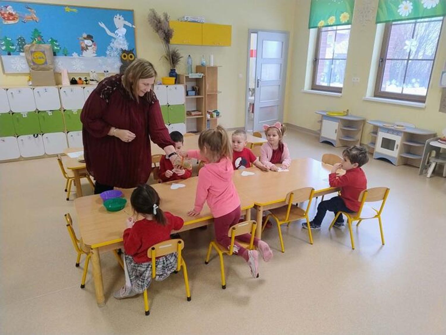 Tego dnia dzieci poznały symbole związane z tym świętem – serce, amorka oraz kartkę walentynkową. Rozmawialiśmy o tym, czym jest przyjaźń, życzliwość i okazywanie sobie wzajemnej sympatii. Podczas zajęć plastycznych przedszkolaki wykonały piękne walentynkowe obrazki z wykorzystaniem puchatej farby. Praca sprawiła dzieciom wiele radości. W tym wyjątkowym dniu dzieci również okazały swoją wdzięczność pracownikom przedszkola, wręczając im kartki z serdecznymi życzeniami. Był to dzień pełen uśmiechu, ciepłych słów i miłych gestów.