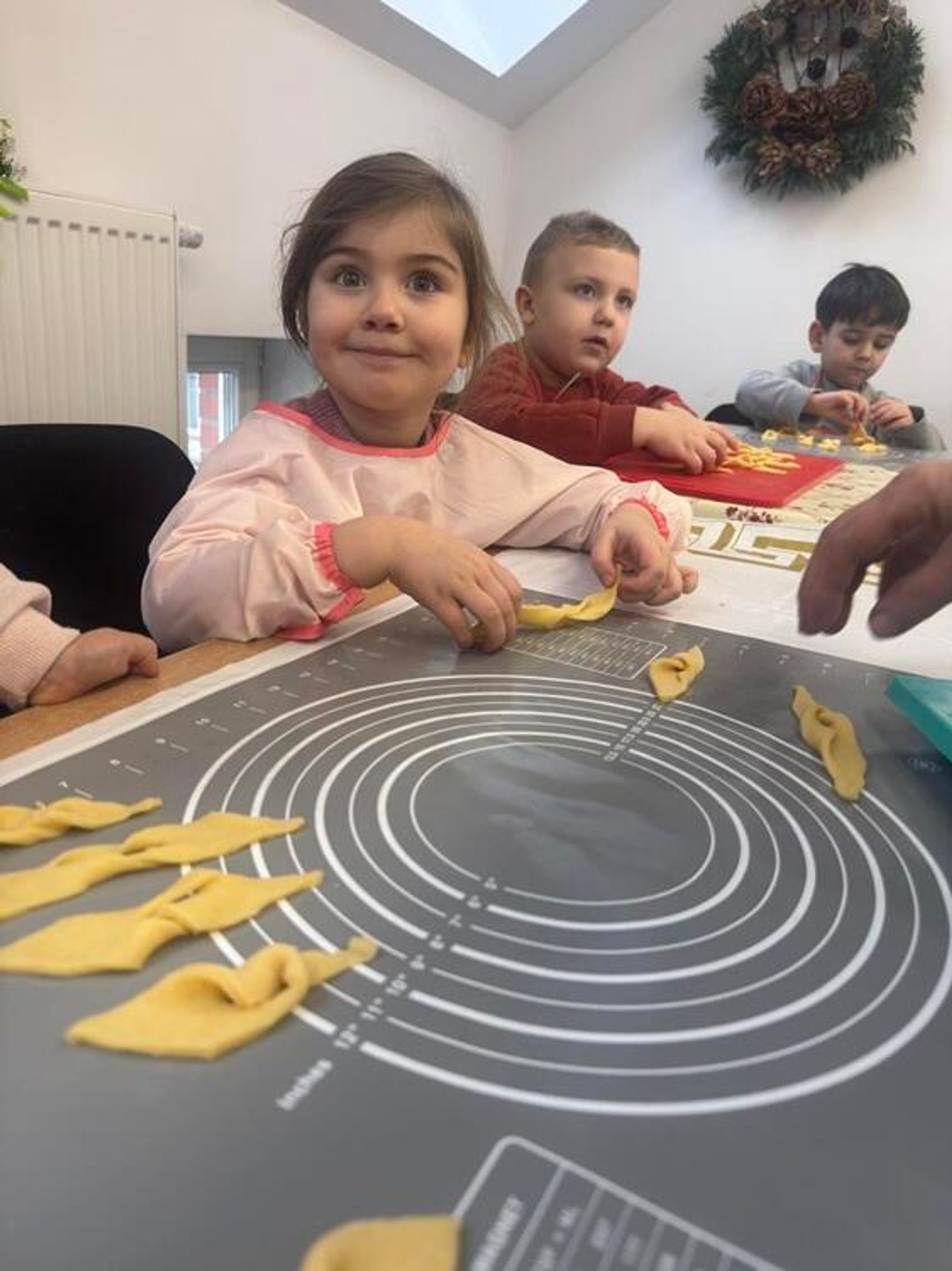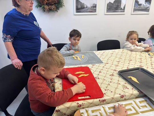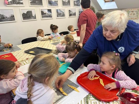 Na miejscu czekali już na nas członkowie Koła. Zadaniem maluchów było przygotowanie pysznych faworków. Dzieci ubrały fartuszki i od razu zabrały się do pracy. Pani Danusia z przygotowanego ciasta wycinała paseczki z dziurką a zadaniem Kotów było ich przewlekanie. Takim sposobem powstały słodkości gotowe do usmażenia. Na początku pomagały nam wszystkie Panie, jednak po chwili "Kotki" nabrały wprawy i robiły faworki w błyskawicznym tempie. Po skończonej pracy zostaliśmy poczęstowani pysznym sokiem oraz usmażonym faworkami. Było przepysznie i bardzo wesoło.