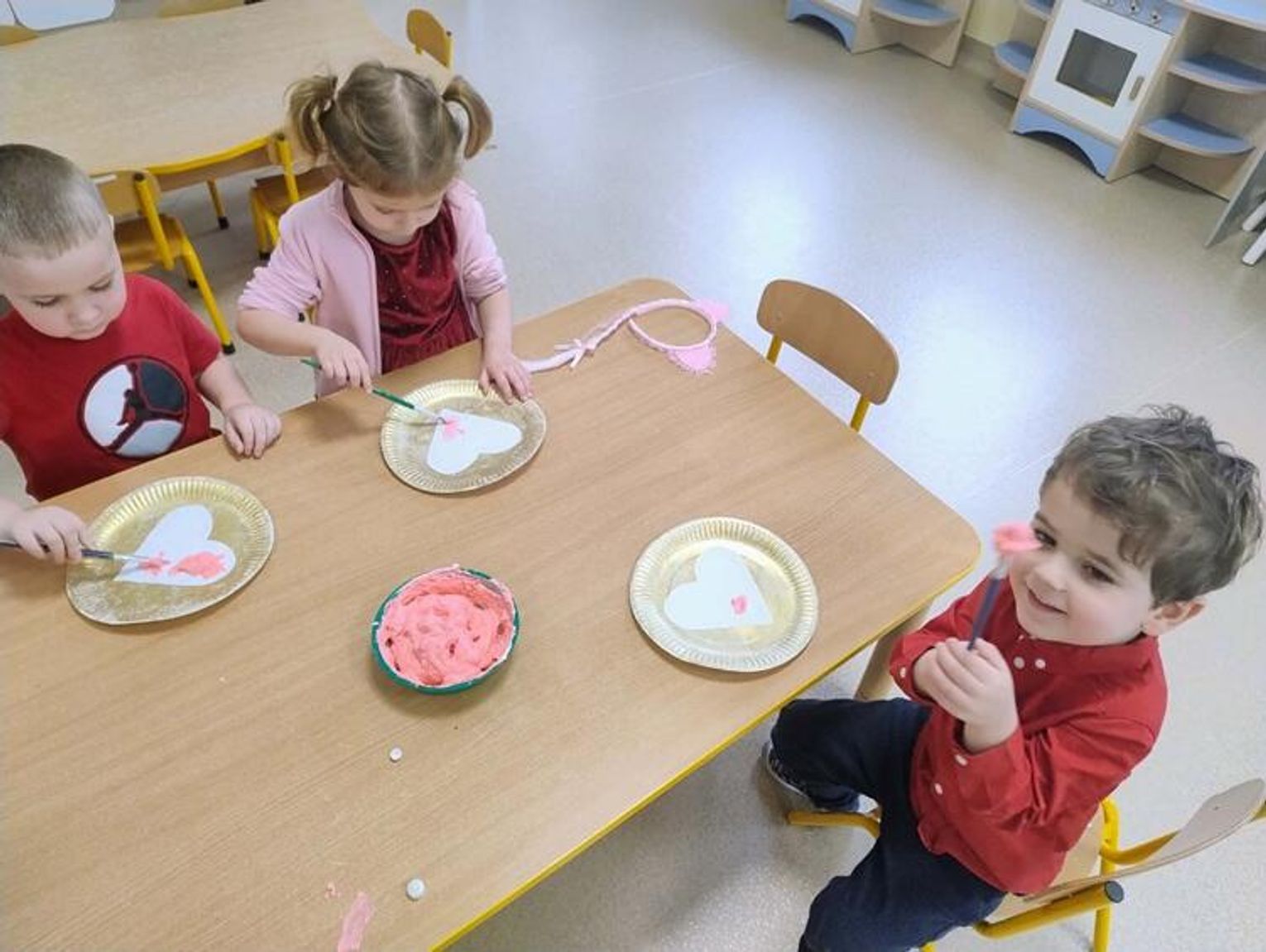 Tego dnia dzieci poznały symbole związane z tym świętem – serce, amorka oraz kartkę walentynkową. Rozmawialiśmy o tym, czym jest przyjaźń, życzliwość i okazywanie sobie wzajemnej sympatii. Podczas zajęć plastycznych przedszkolaki wykonały piękne walentynkowe obrazki z wykorzystaniem puchatej farby. Praca sprawiła dzieciom wiele radości. W tym wyjątkowym dniu dzieci również okazały swoją wdzięczność pracownikom przedszkola, wręczając im kartki z serdecznymi życzeniami. Był to dzień pełen uśmiechu, ciepłych słów i miłych gestów.