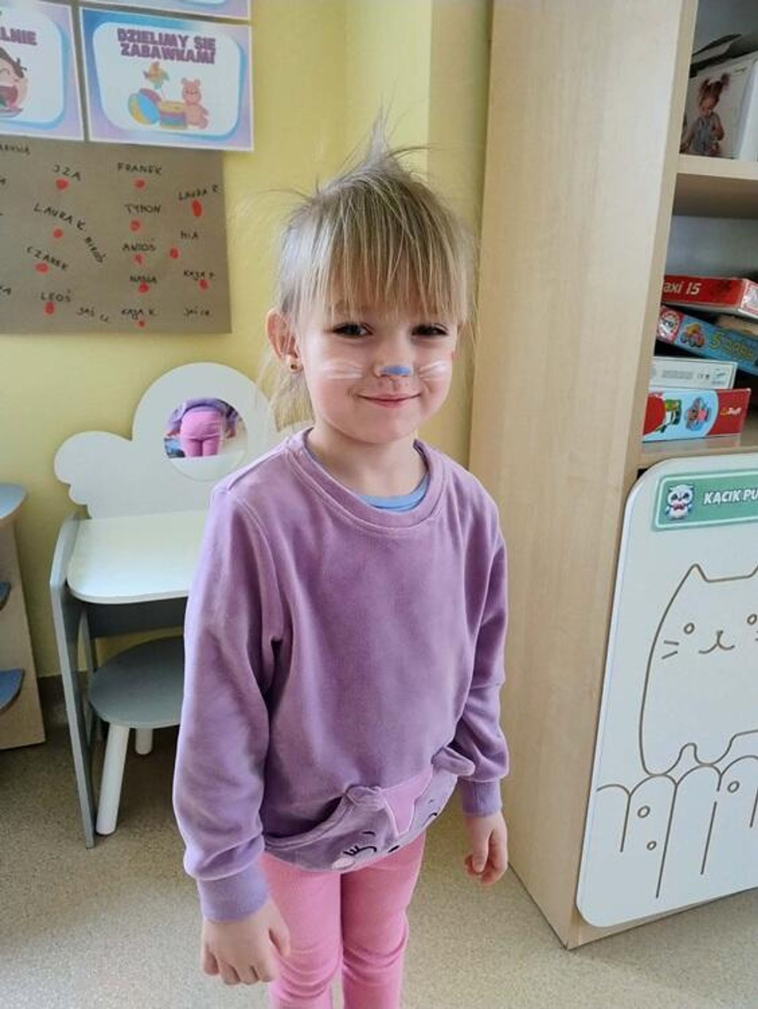 Dzieci poszerzyły swoją wiedzę na temat potrzeb kotów – dowiedziały się, jak należy o nie dbać, czym je karmić oraz jak zapewnić im odpowiednią opiekę. Przedszkolaki poznały także różne rasy kotów oraz wiele ciekawostek z ich życia. Podczas zajęć nie zabrakło również aktywności plastycznych i zabawy. Chętne dzieci mogły pomalować sobie twarz w kocie wzory, a także wykonać własnego kotka z papieru. Dzień upłynął w radosnej atmosferze i pozwolił dzieciom rozwijać zainteresowania oraz wrażliwość na potrzeby zwierząt.
