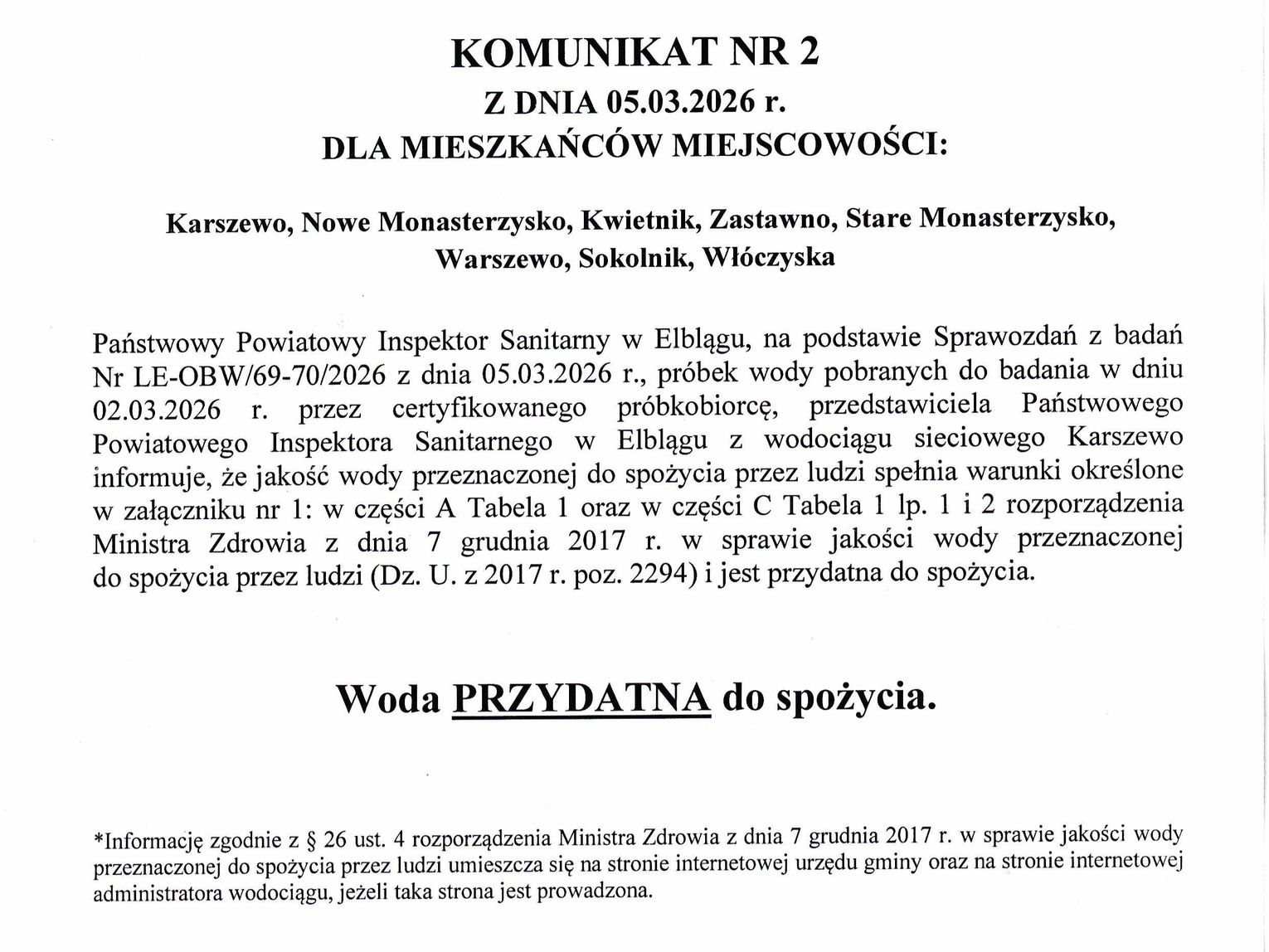 Informujemy, że woda z sieci wodociągowej w miejscowościach: Zastawno, Sokolnik, Kwietnik, Nowe Monasterzysko, Stare Monasterzysko, Karszewo, Warszewo oraz Włóczyska jest zdatna do picia i może być bezpiecznie używana do celów spożywczych.