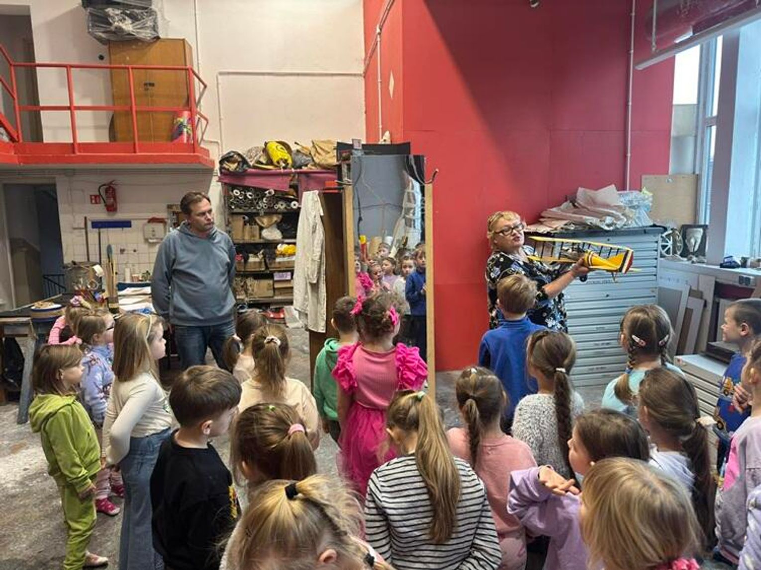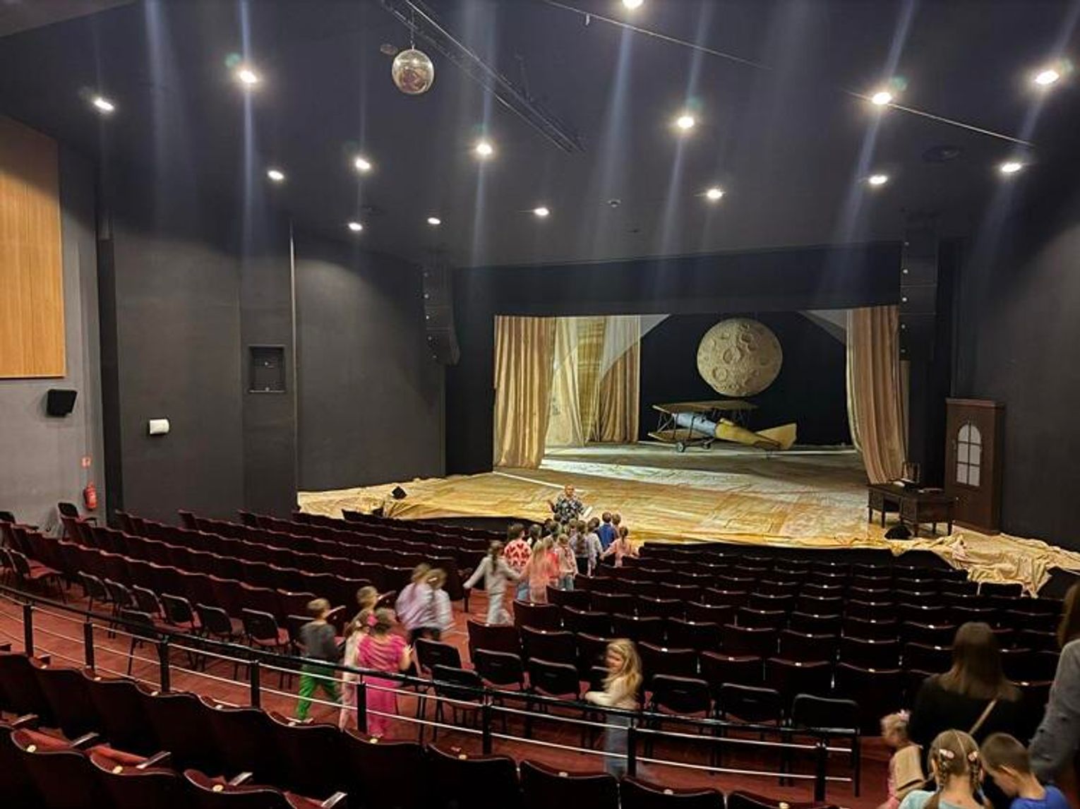Podczas spaceru po kulisach teatru przedszkolaki zwiedziły scenę, widownię, miejsce zwane "kieszenią", gdzie przechowywana jest cała scenografia do różnych spektakli, charakteryzatornię, a także garderoby aktorów. Dzieci miały okazję przyjrzeć się z bliska rekwizytom i kostiumom teatralnym.