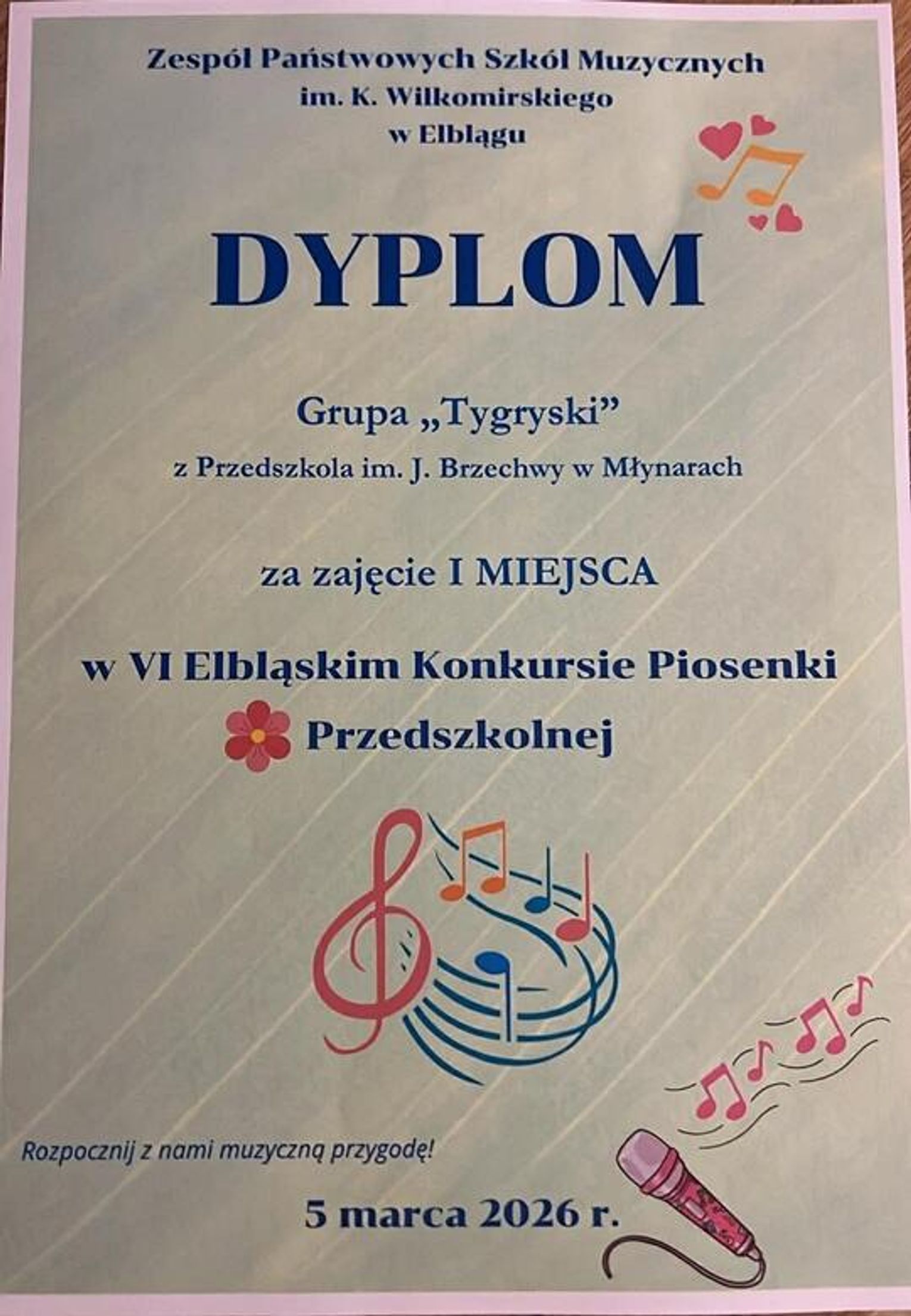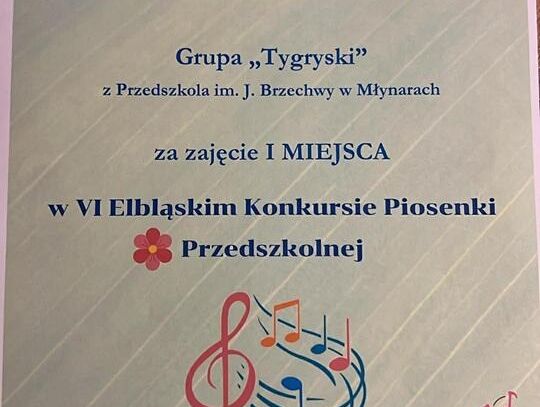Dzisiaj dzieci z grupy "Tygryski" wzięły udział w VI Elbląskim Konkursie Piosenki Przedszkolnej, który odbył się w Zespole Szkół Muzycznych im. Kazimierza Wiłkomirskiego w Elblągu. Mali artyści wykonali utwór pt.: "Wiosna, Wiosenka", a zaprezentowali się tak znakomicie, że zdobyli I miejsce!!!