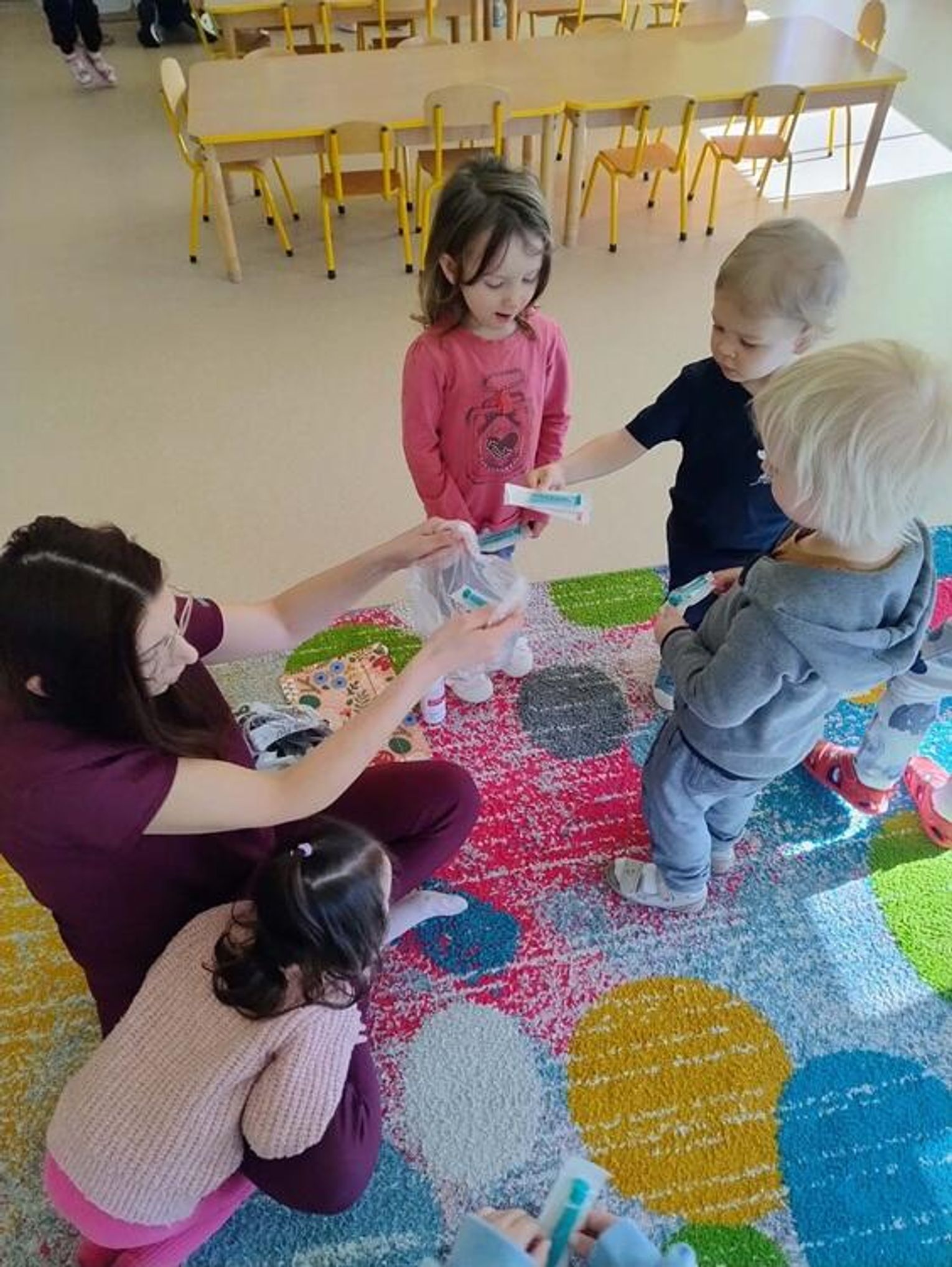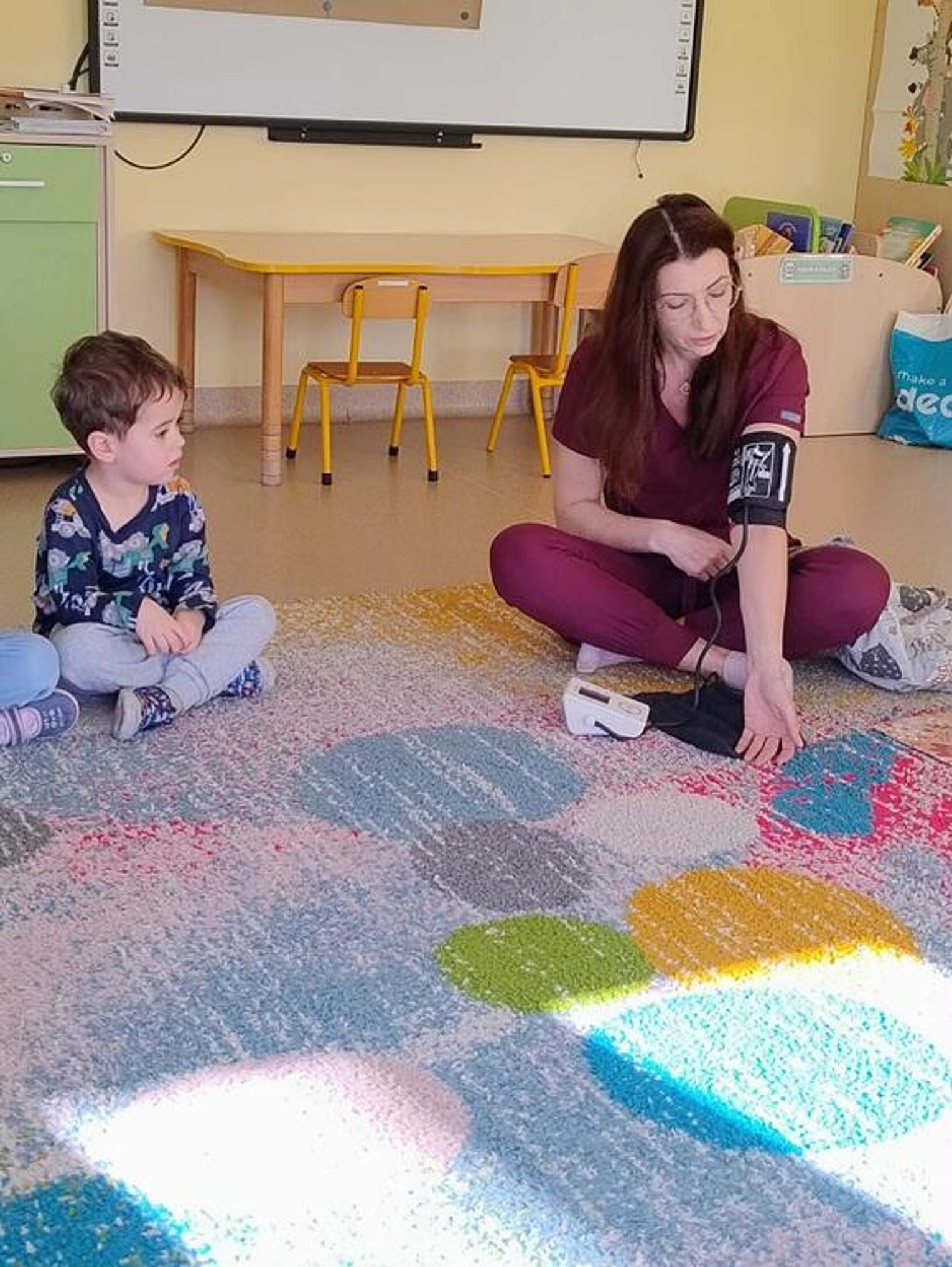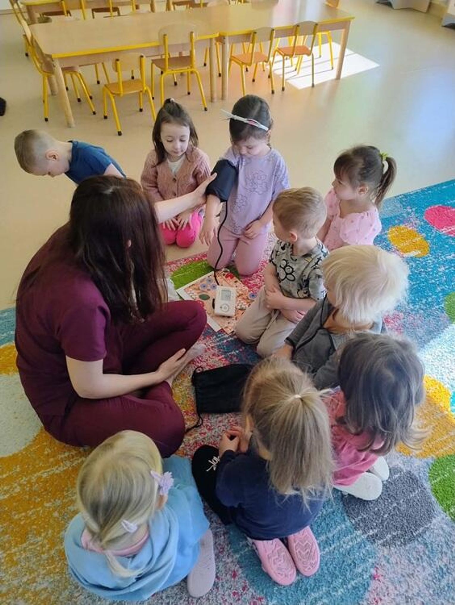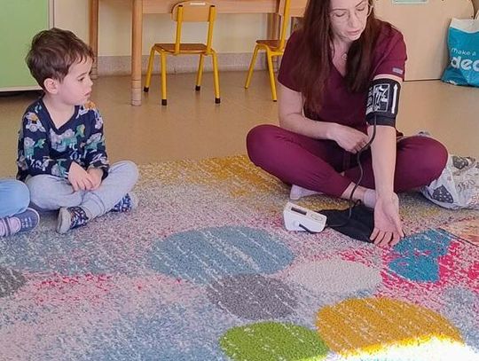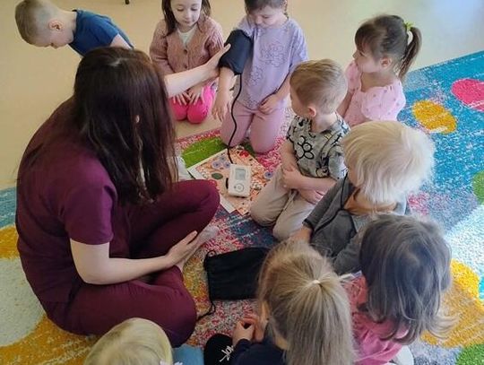 Podczas spotkania dzieci miały okazję dowiedzieć się, na czym polega praca pielęgniarki oraz jak ważną rolę pełni ona w opiece nad pacjentami. Największym zainteresowaniem cieszyła się część praktyczna – dzieci mogły samodzielnie sprawdzić, jak mierzy się ciśnienie tętnicze, a także posłuchać bicia swojego serca za pomocą stetoskopu. Na zakończenie spotkania każde dziecko otrzymało na pamiątkę drobne upominki – strzykawki do zabawy oraz kolorowanki.