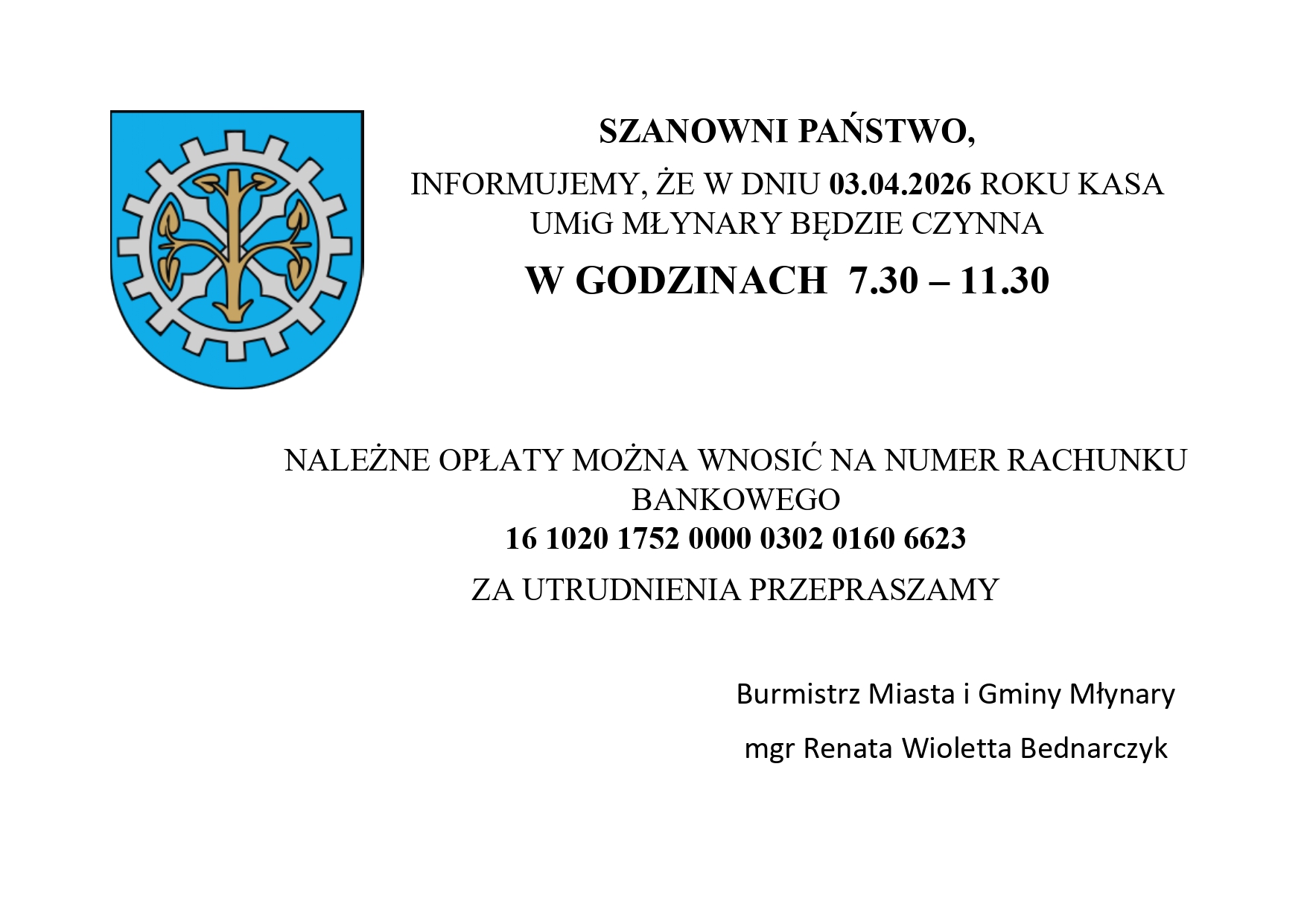 Inormacja dot. godzin otwarcia kasy urzędu w dniu 03 kwietnia 2026 roku (piątek)