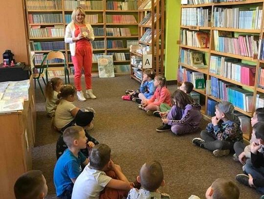 W trakcie pobytu w bibliotece przedszkolaki rozwiązywały zagadki związane z postaciami z bajek i baśni. Na zakończenie spotkania dzieci złożyły pani Beacie życzenia z okazji Dnia Bibliotekarza i Bibliotek oraz wręczyły Jej kwiatka.