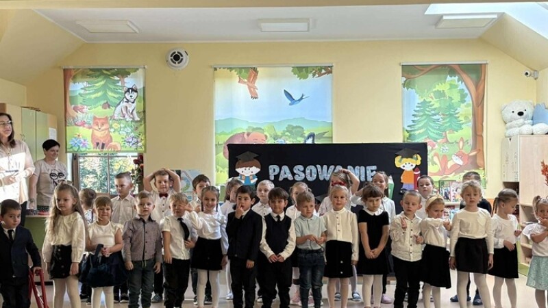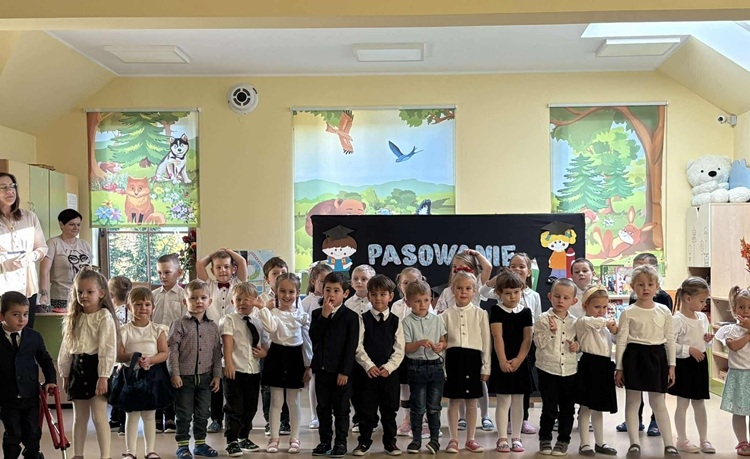 Cała przedszkolna społeczność wraz z zaproszonymi gośćmi: panią Renatą Bednarczyk - Burmistrz Miasta i Gminy Młynary, panią Anną Kołodziej-Rabiczko - Sekretarz Miasta i Gminy Młynary, oraz Rodzicami, spotkała się o godzinie 10:00 na uroczystości pasowania dwóch grup przedszkolnych "Kotków" i Jeżyków".