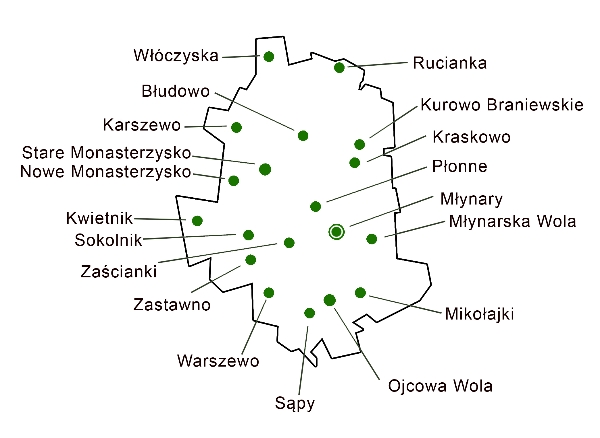 W skład Gminy wchodzi 29 miejscowości, które tworzą 19 sołectw . Na ogólnej powierzchni 15 709 ha zamieszkuje 4569 osób, w tym w mieście Młynary 1817 osoby (dane na 2016 r.).