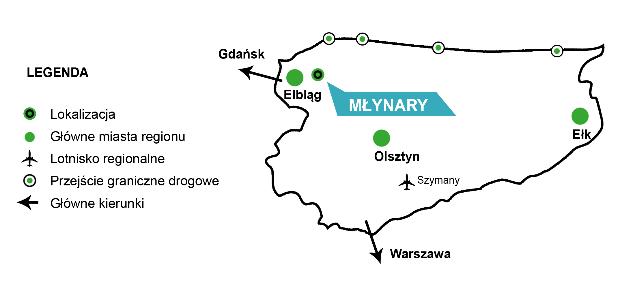 Tereny inwestycyjne Gminy Młynary położone są w mieście Młynary, skomunikowane z drogą wojewódzką, w bliskiej odległości od drogi ekspresowej, przy bocznicy kolejowej, 30 km od Elbląga i Braniewa. Dobrze rozwinięta infrastruktura wodociągowa, kanalizacyjna, energetyczna, internet.