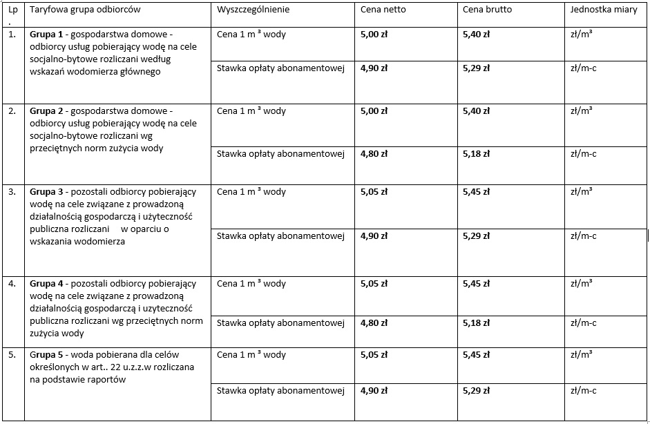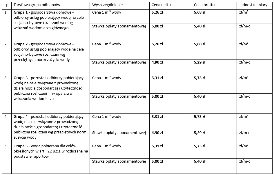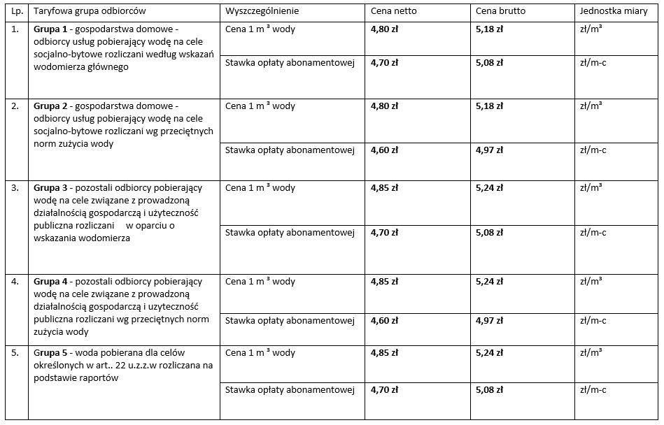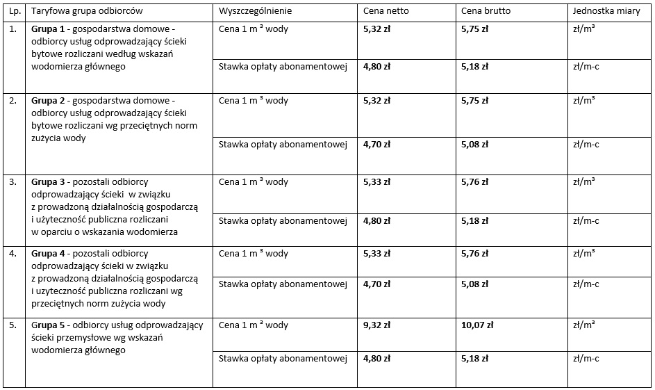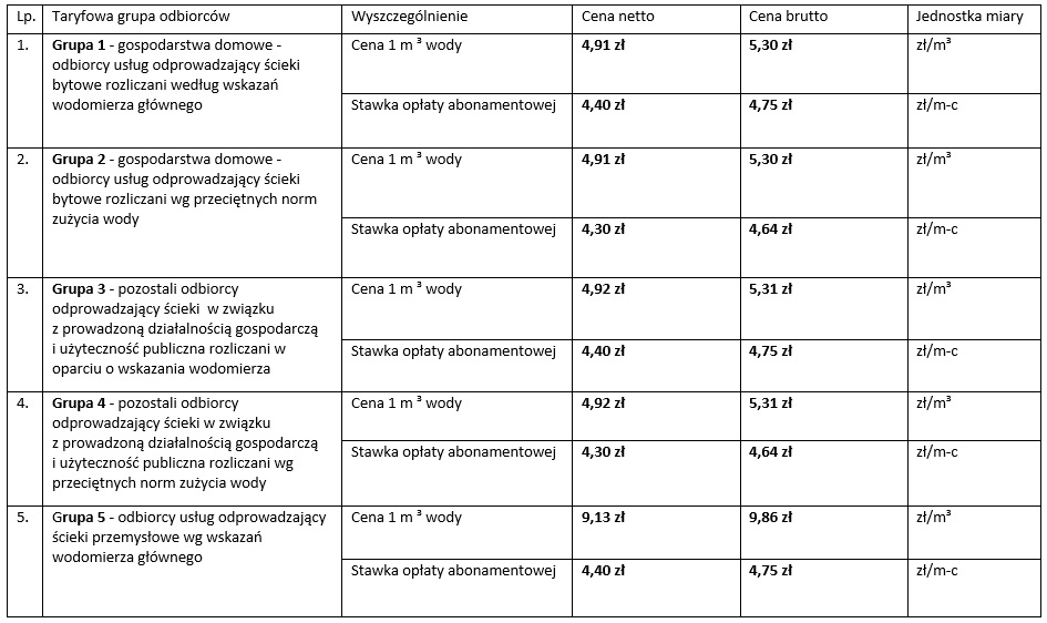 Obowiązująca taryfa za zbiorowe zaopatrzenie w wodę i odprowadzanie ścieków na okres od 12.09.2024 r. do 11.09.2025 r.