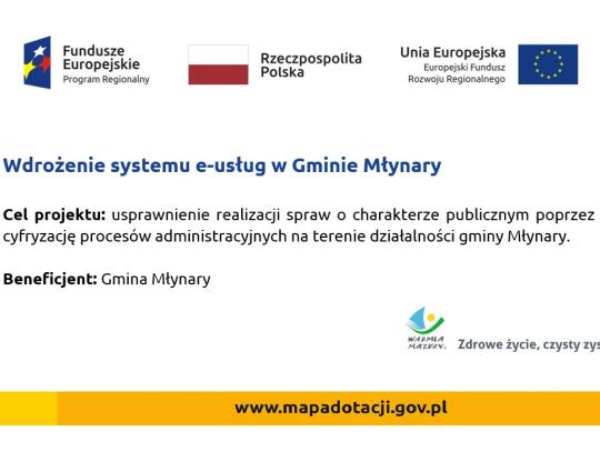 Pojekt pn. "Wdrożenie systemu e-usług w Gminie Młynary" realizowany był w okresie od 17 kwietnia 2019 r. do 31 lipca 2022 r. W ramach projektu zrealizowano następującyee działania: